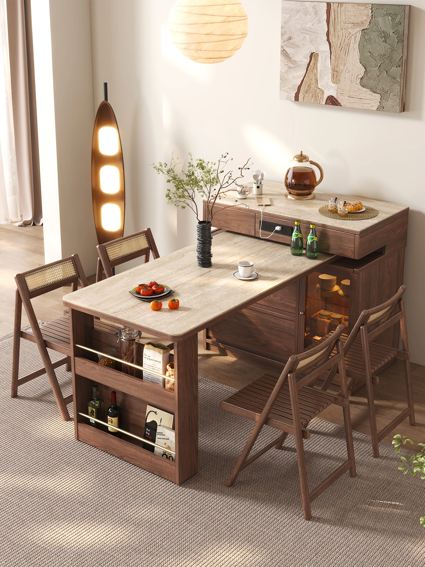 Japanese Style Solid Wood Expandable Bar Table with Storage Cabinet - Versatile Island for Small Spaces, Perfect for Home Living Rooms and Dining Areas