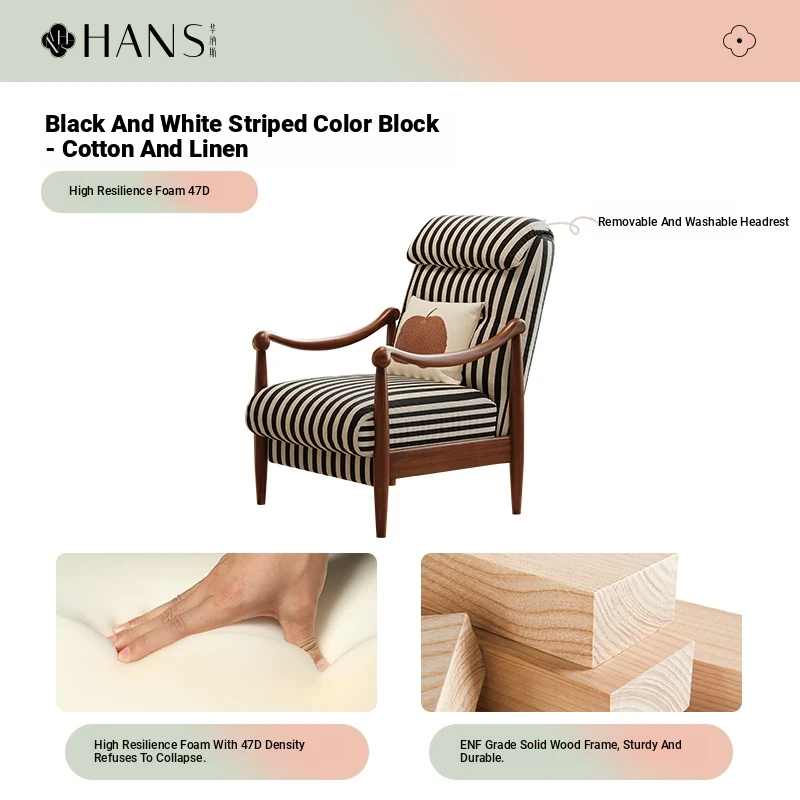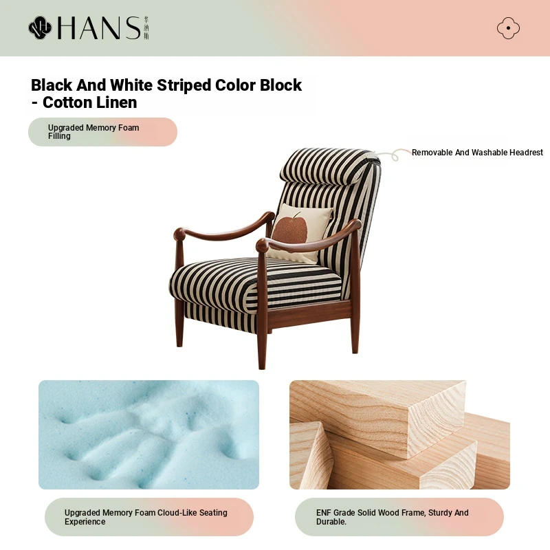 【Imported North American White Ash Sofa Chair】Black and White Striped Color Block - Upgraded Cotton Linen Headrest, Removable and Washable