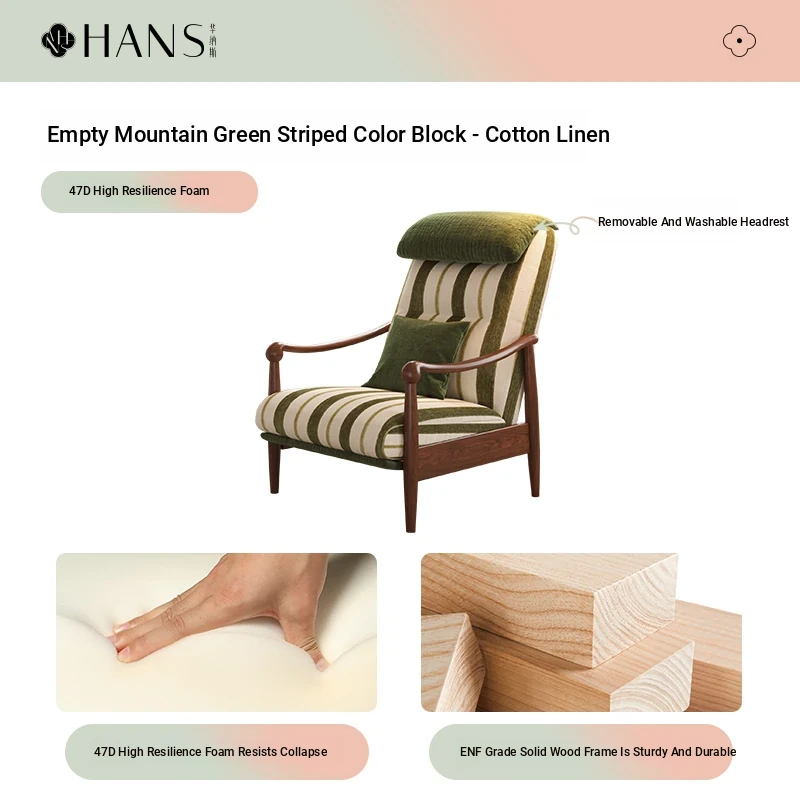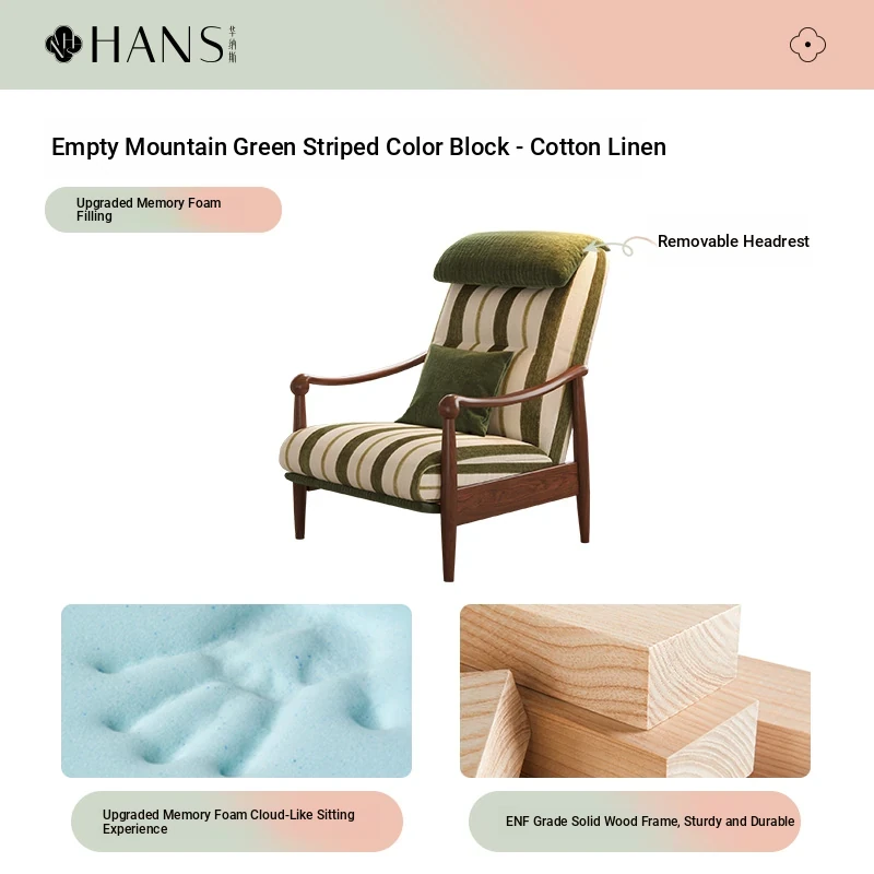 【Imported North American White Ash Sofa Chair】Sky Mountain Green - Striped Color Block - Upgraded Cotton Linen Detachable & Washable Headrest