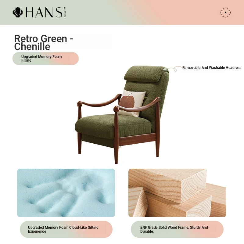 【Imported North American White Ash Sofa Chair】Vintage Green - Chenille / Upgraded Memory Foam Filling, Upgraded Detachable & Washable Headrest
