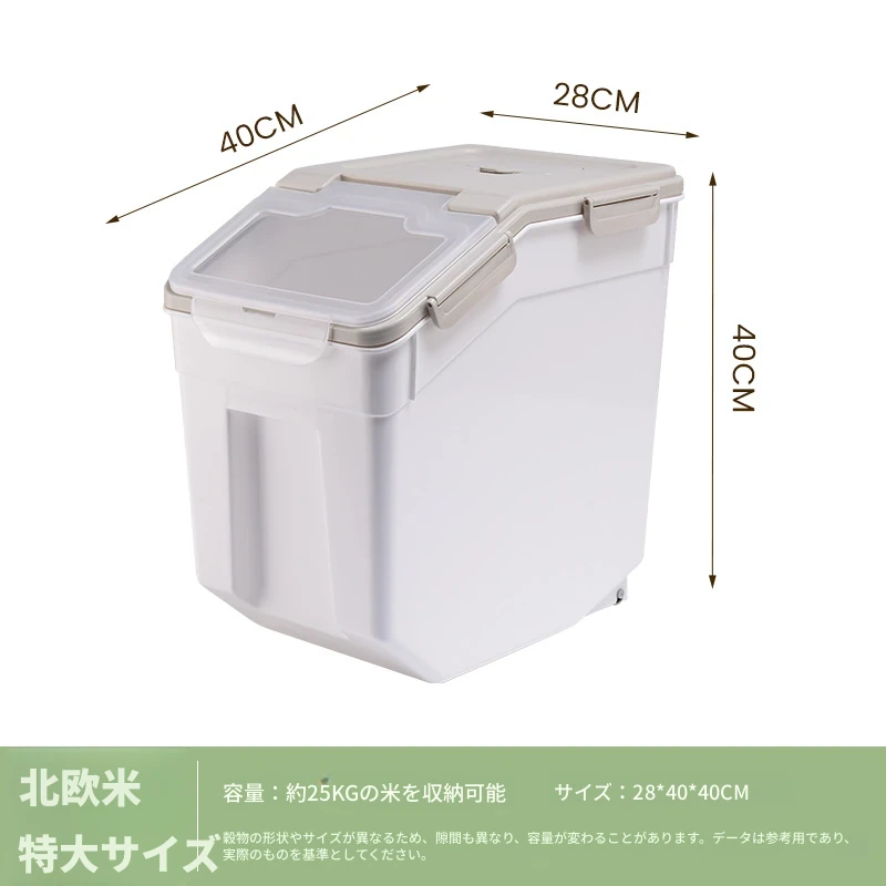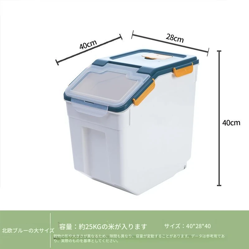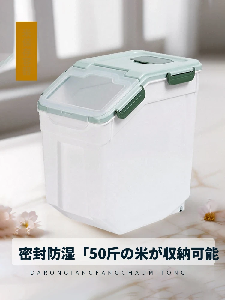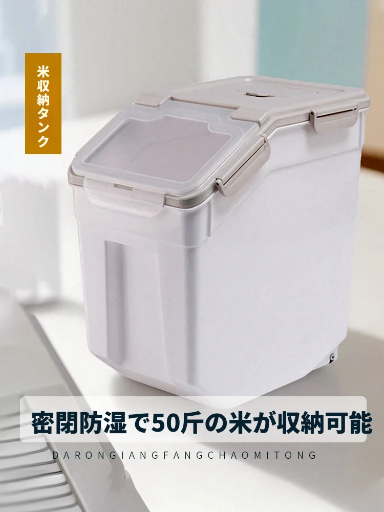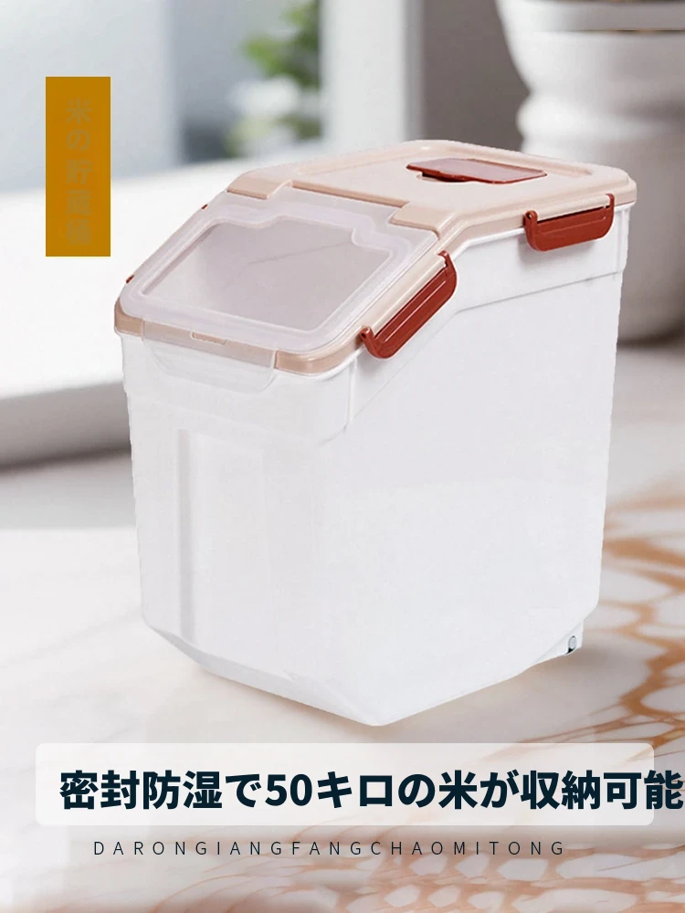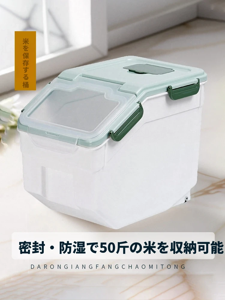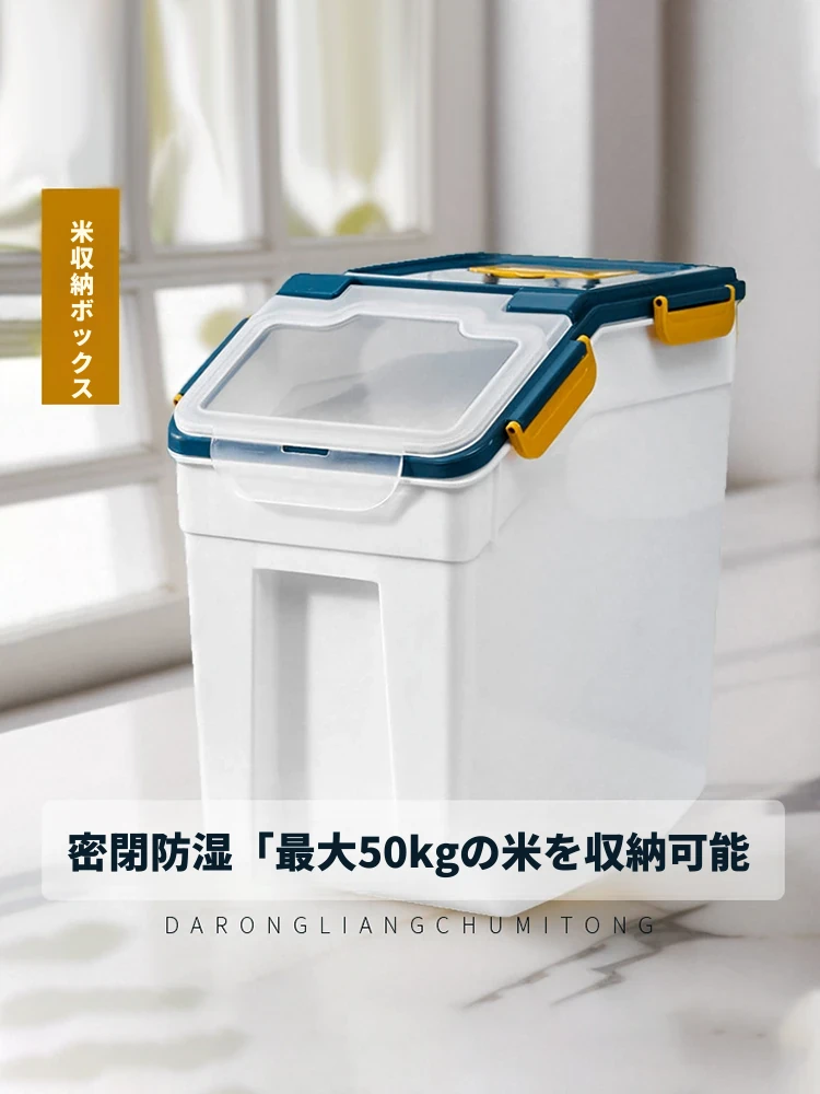 家庭用50斤米収納容器 - 防湿・防虫・密閉設計の厚手プラスチック製、粉類も収納可能な大容量米びつ。キッチンをすっきり整理し、食材を新鮮に保ちます!