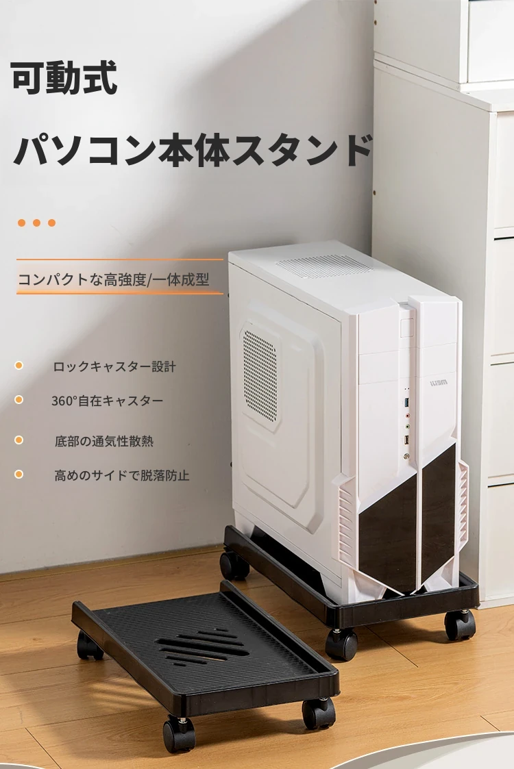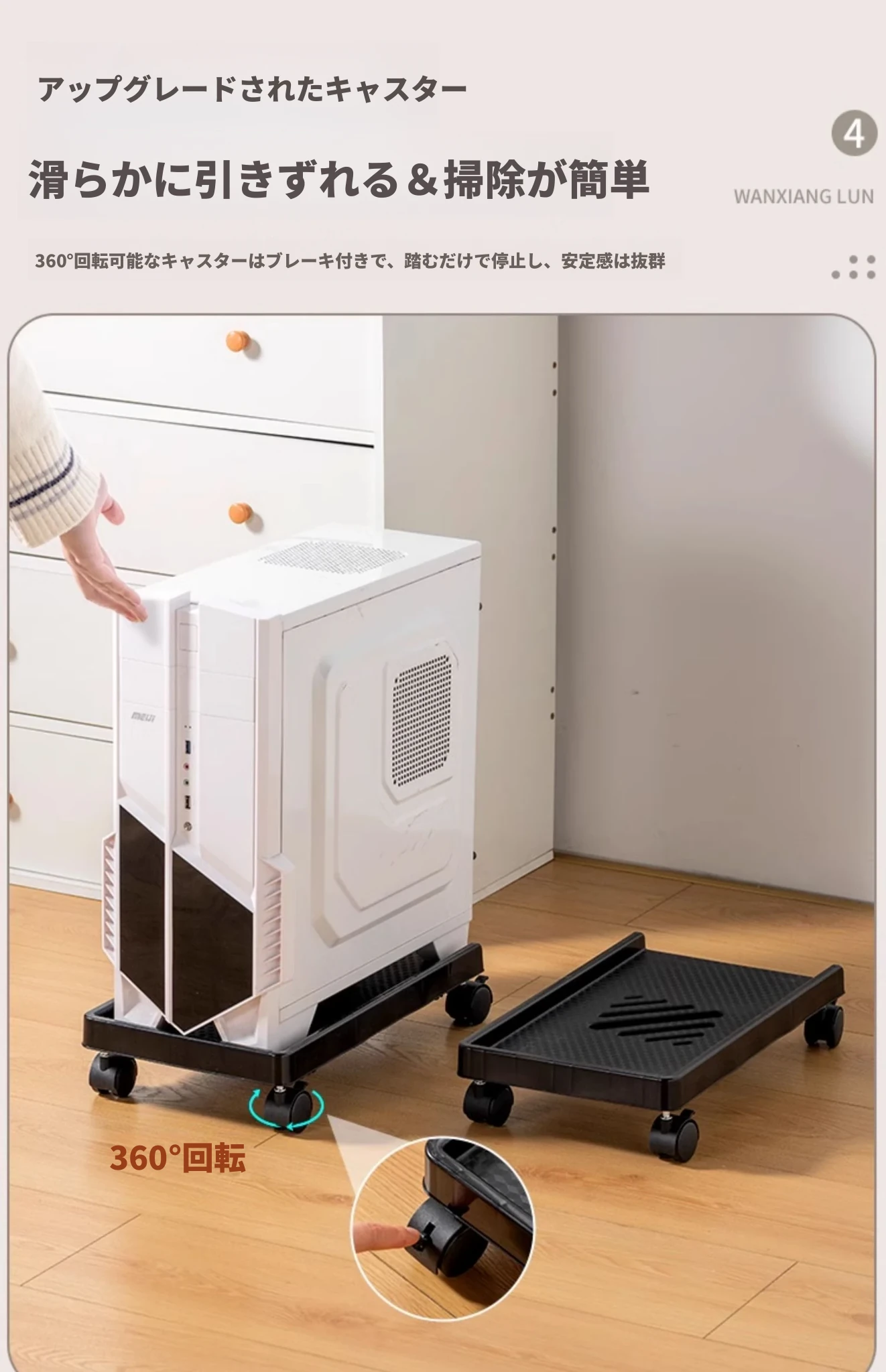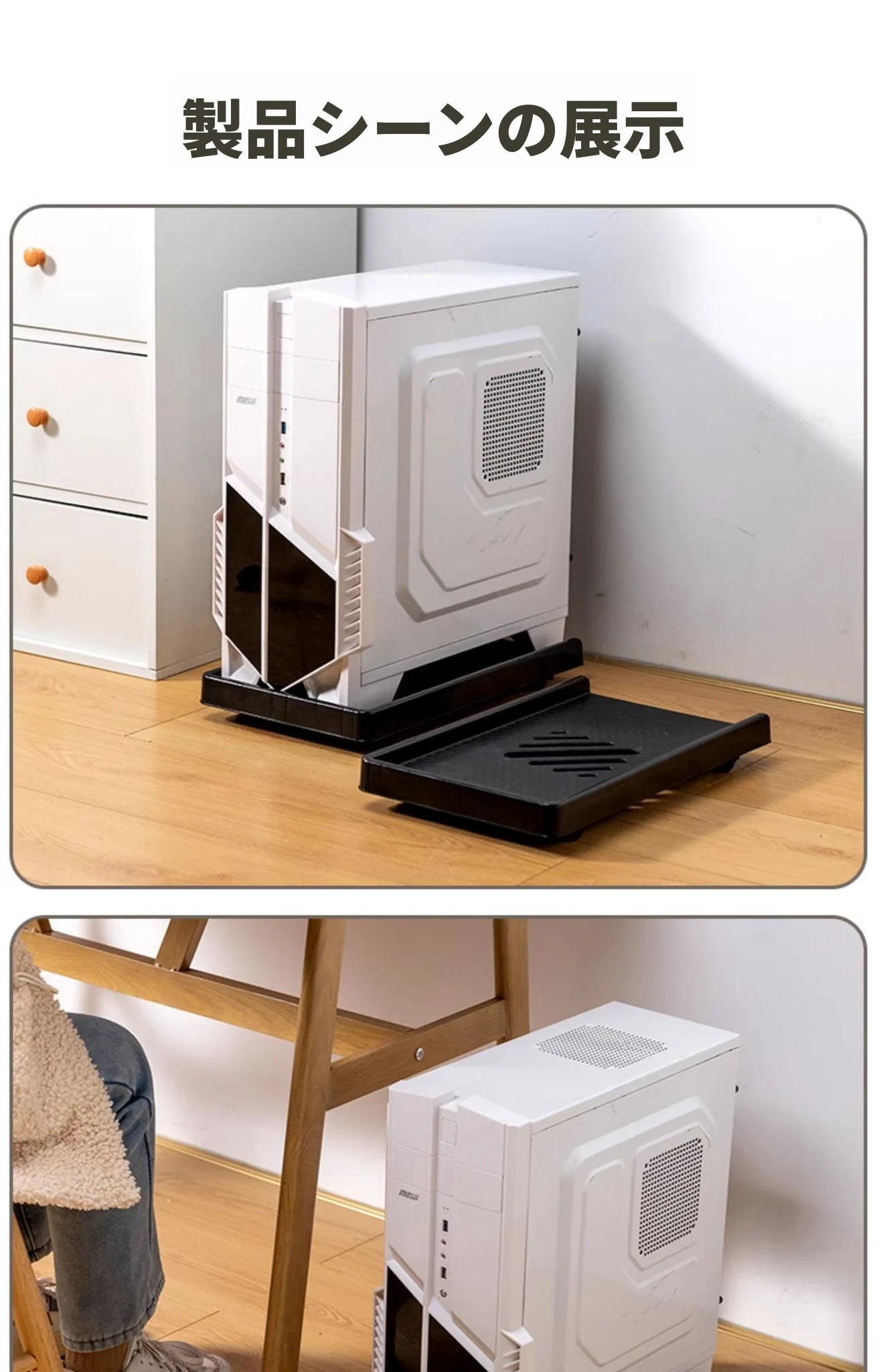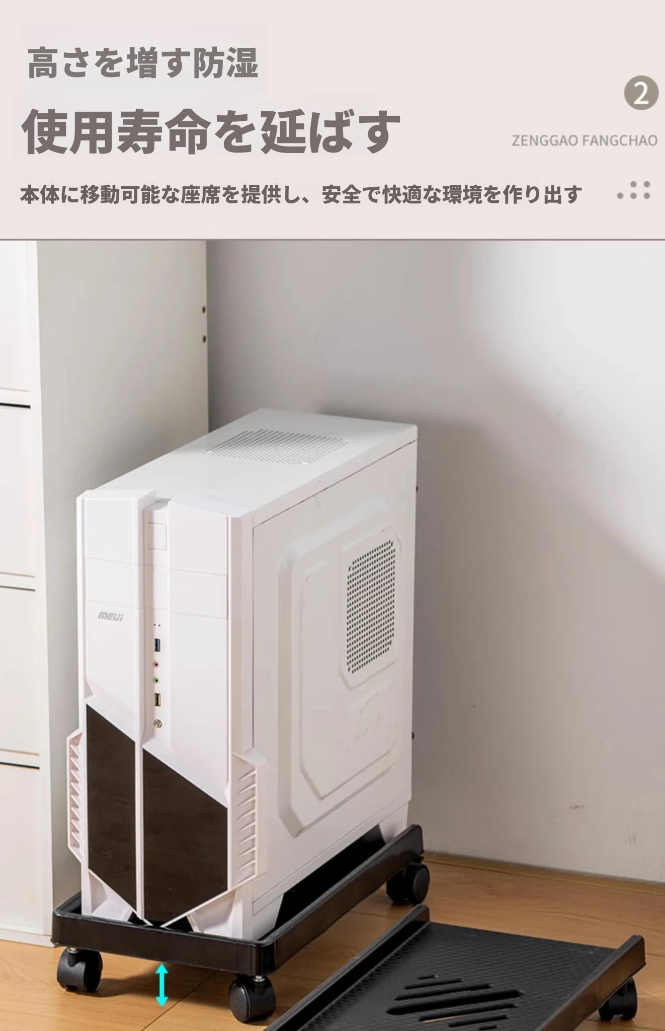 デスクトップPC用移動式ケーススタンド - 家庭やオフィスに最適な高さ調整可能なボトムベース&収納トレイ!快適な作業環境を実現し、スペースを有効活用!
