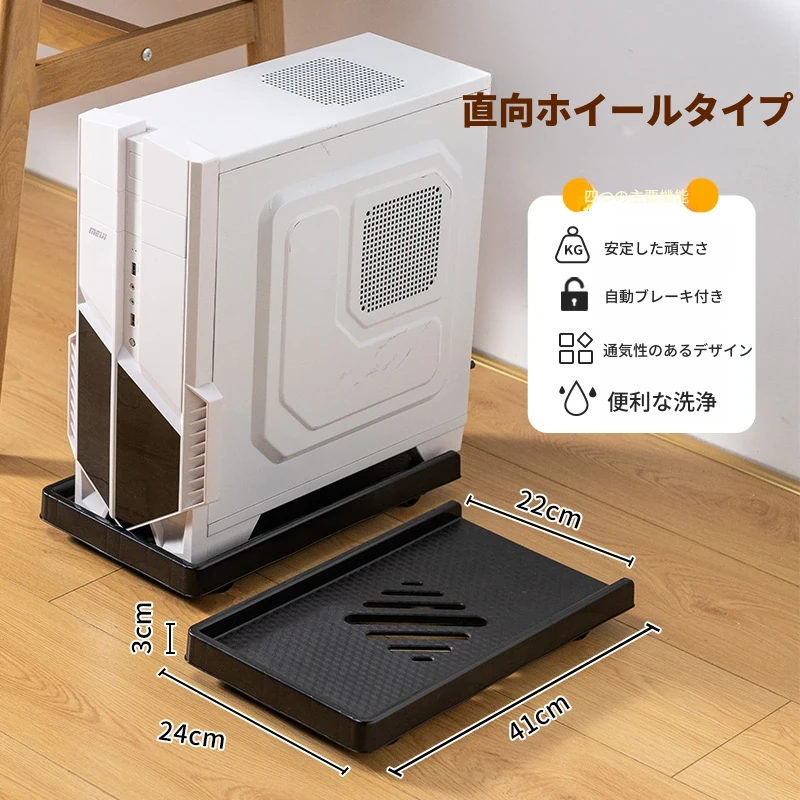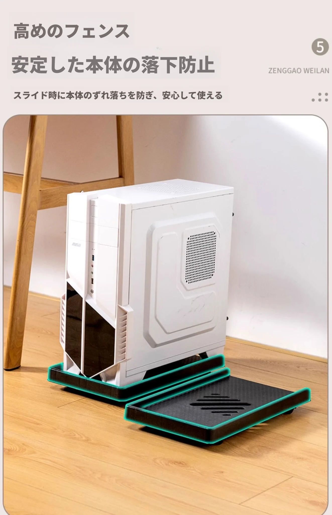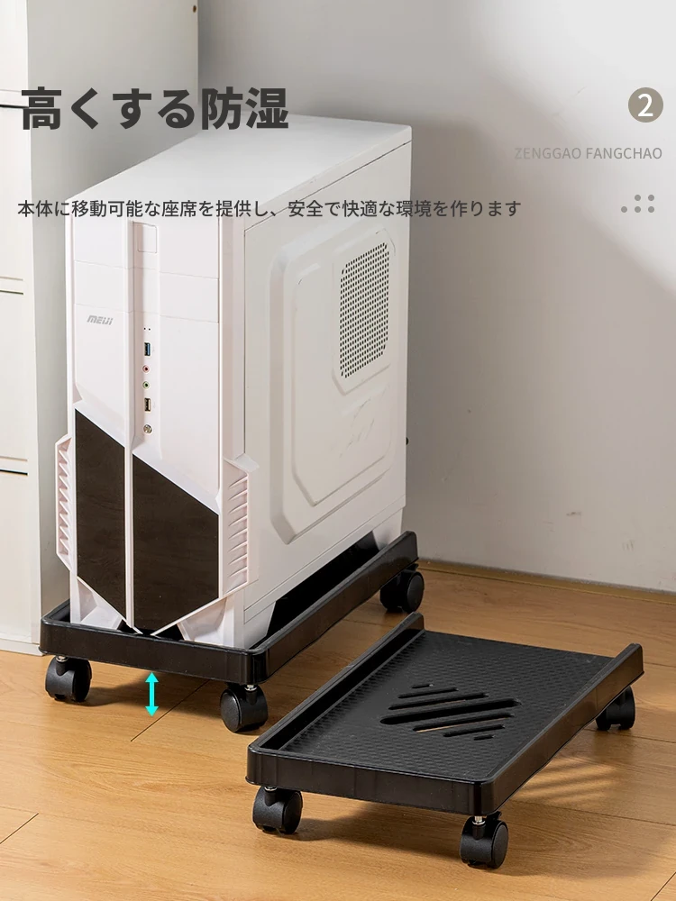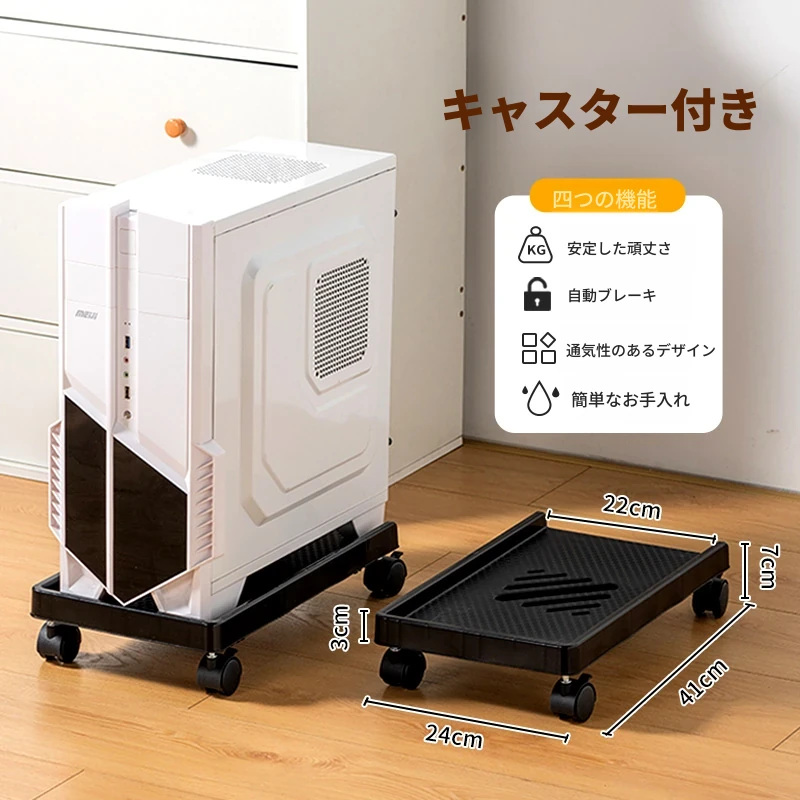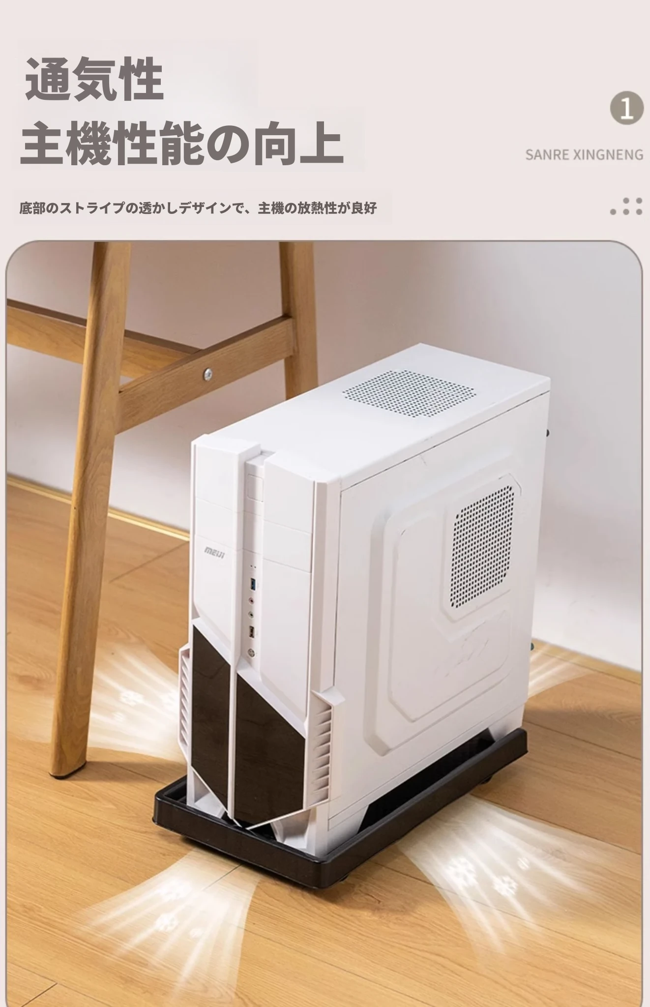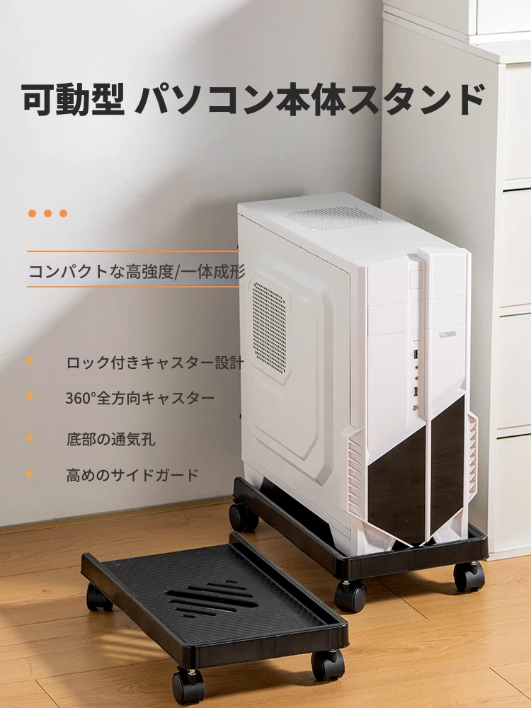 デスクトップPC用移動式ケーススタンド - 家庭やオフィスに最適な高さ調整可能なボトムベース&収納トレイ!快適な作業環境を実現し、スペースを有効活用!