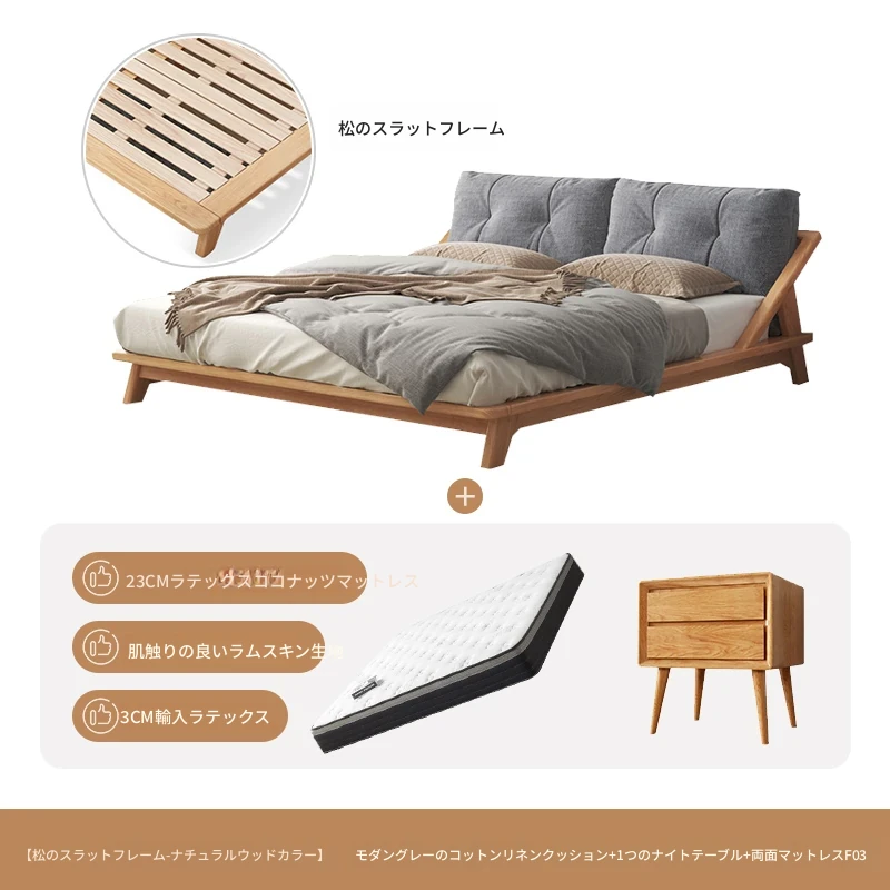 【マットレスセット-ナチュラルカラー】グレーのコットンリネンベッド+1つのナイトスタンド+両面ラテックスマット(23cm)#F03