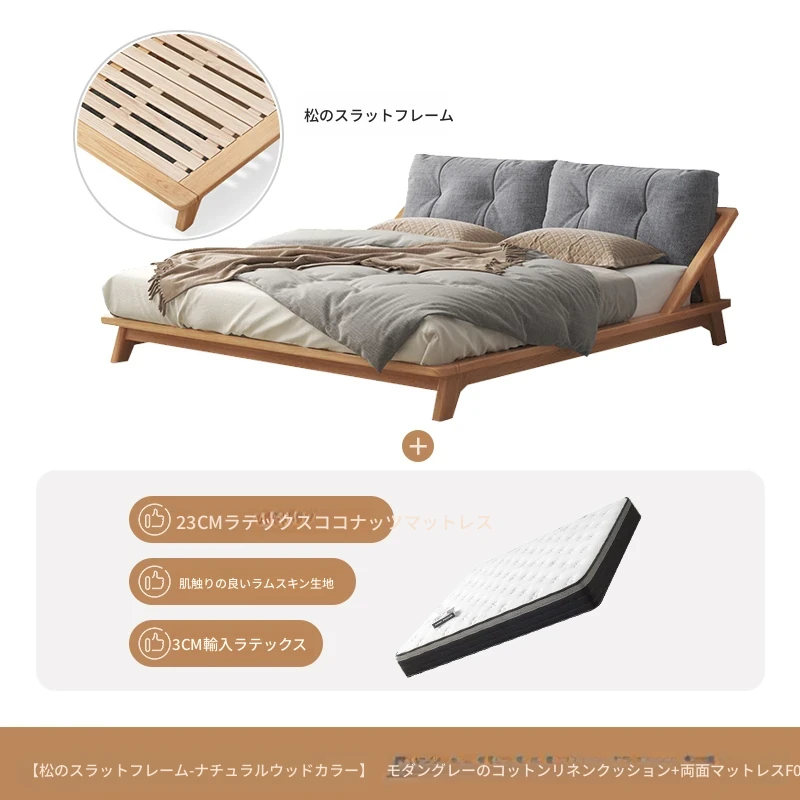 【マットレスセット-ビーチ材ベッドボード】グレーのコットンリネンクッション+両面ラテックスマット(23cm)#F03