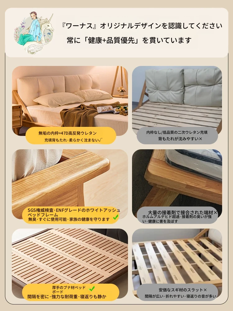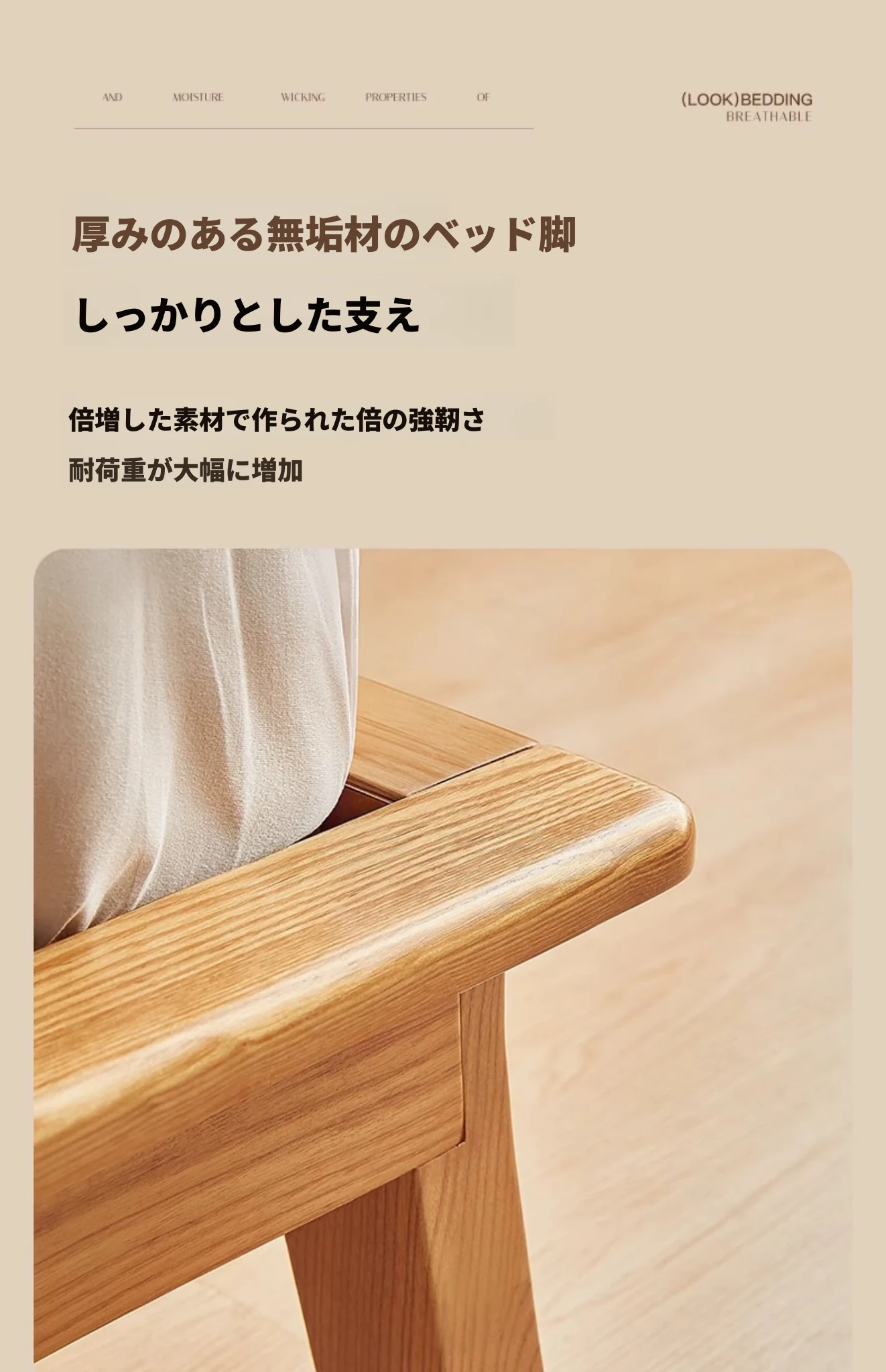 クッション高さアップ版【アップグレードビーチ材ベッドボード+ホワイトアッシュフレーム/ナチュラルカラー】アイボリーのコットンリネン