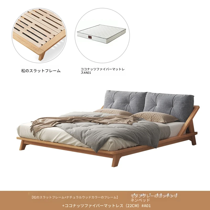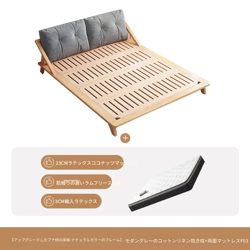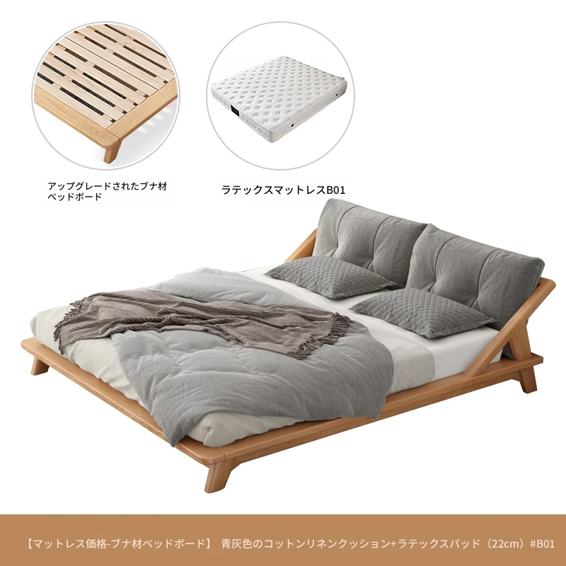 【マットレスセット-ビーチ材ベッドボード】グレーのコットンリネンクッション+ラテックスマット(22cm)#B01
