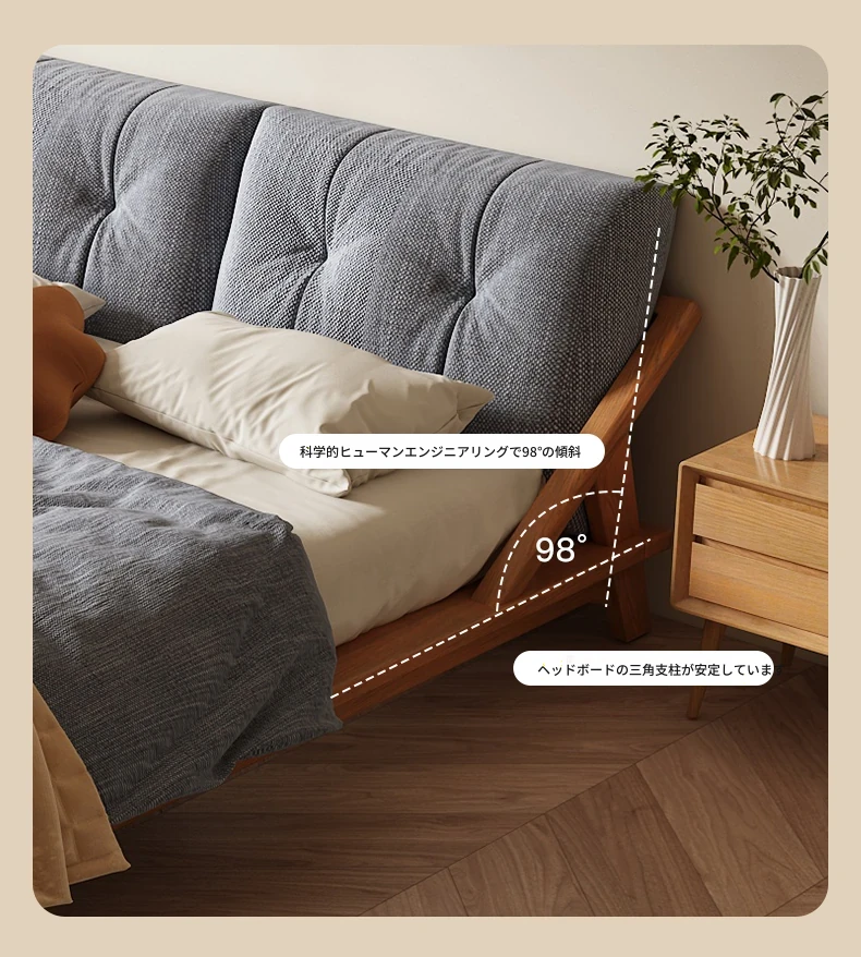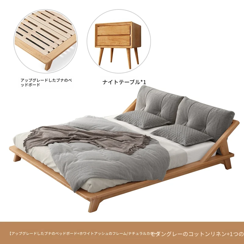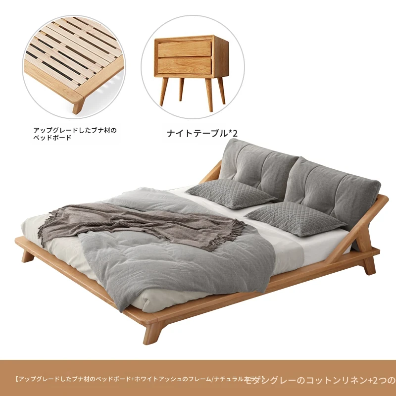 【アップグレードビーチ材ベッドボード+ホワイトアッシュフレーム/ナチュラルカラー】グレーのコットンリネン+2つのナイトスタンド