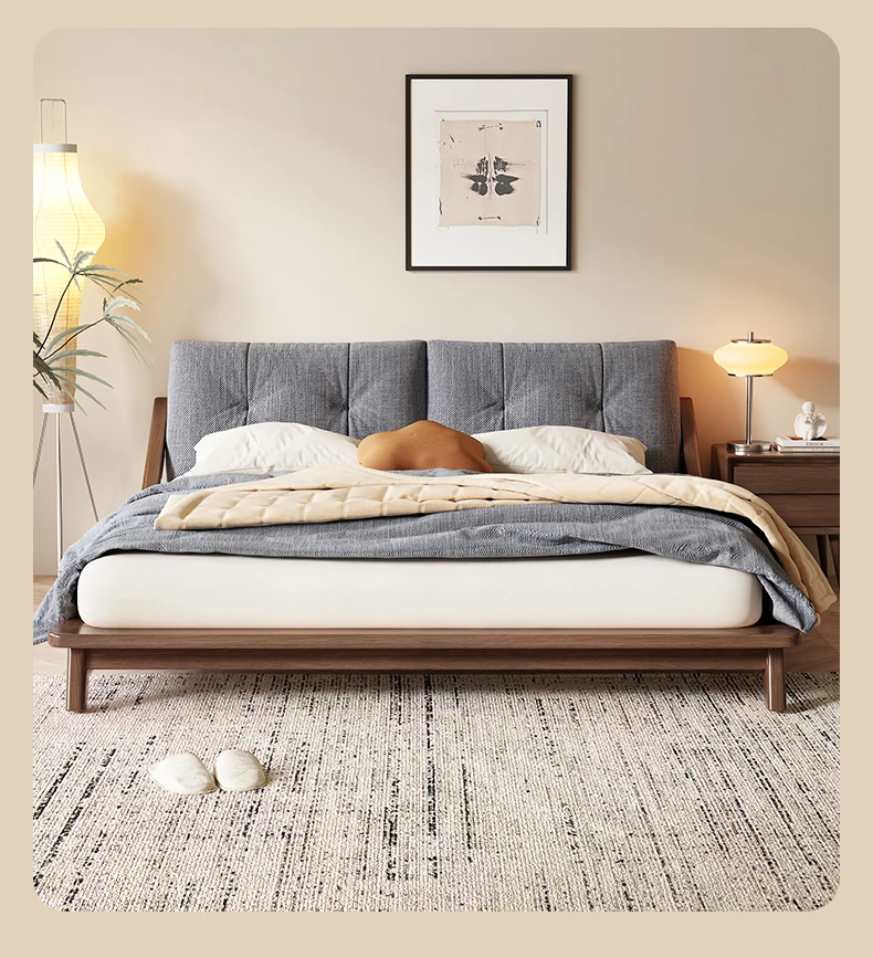 クッション高さアップ版【アップグレードビーチ材ベッドボード+ホワイトアッシュフレーム/ウォールナットカラー】グレーのコットンリネン