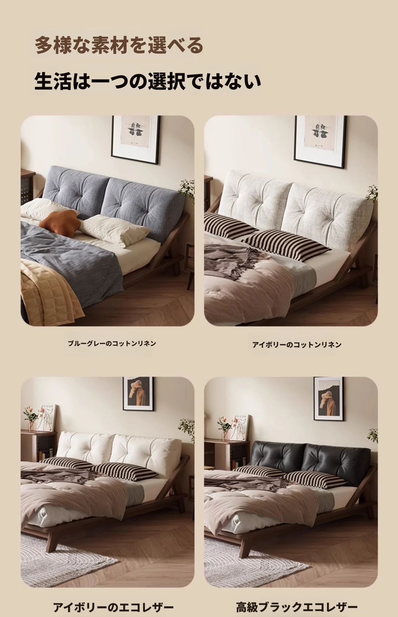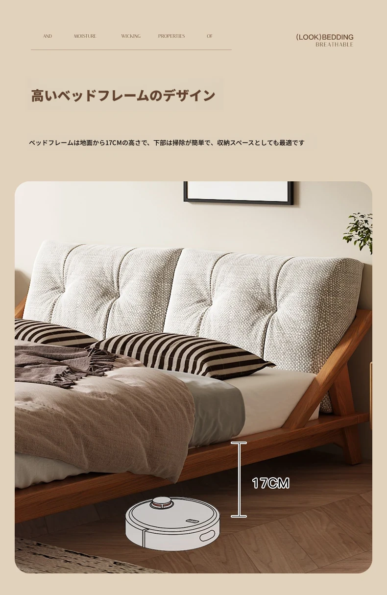クッション高さアップ版【アップグレードビーチ材ベッドボード+ホワイトアッシュフレーム/ウォールナットカラー】アイボリーのコットンリネン