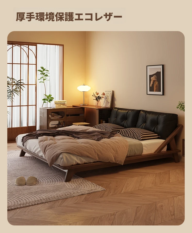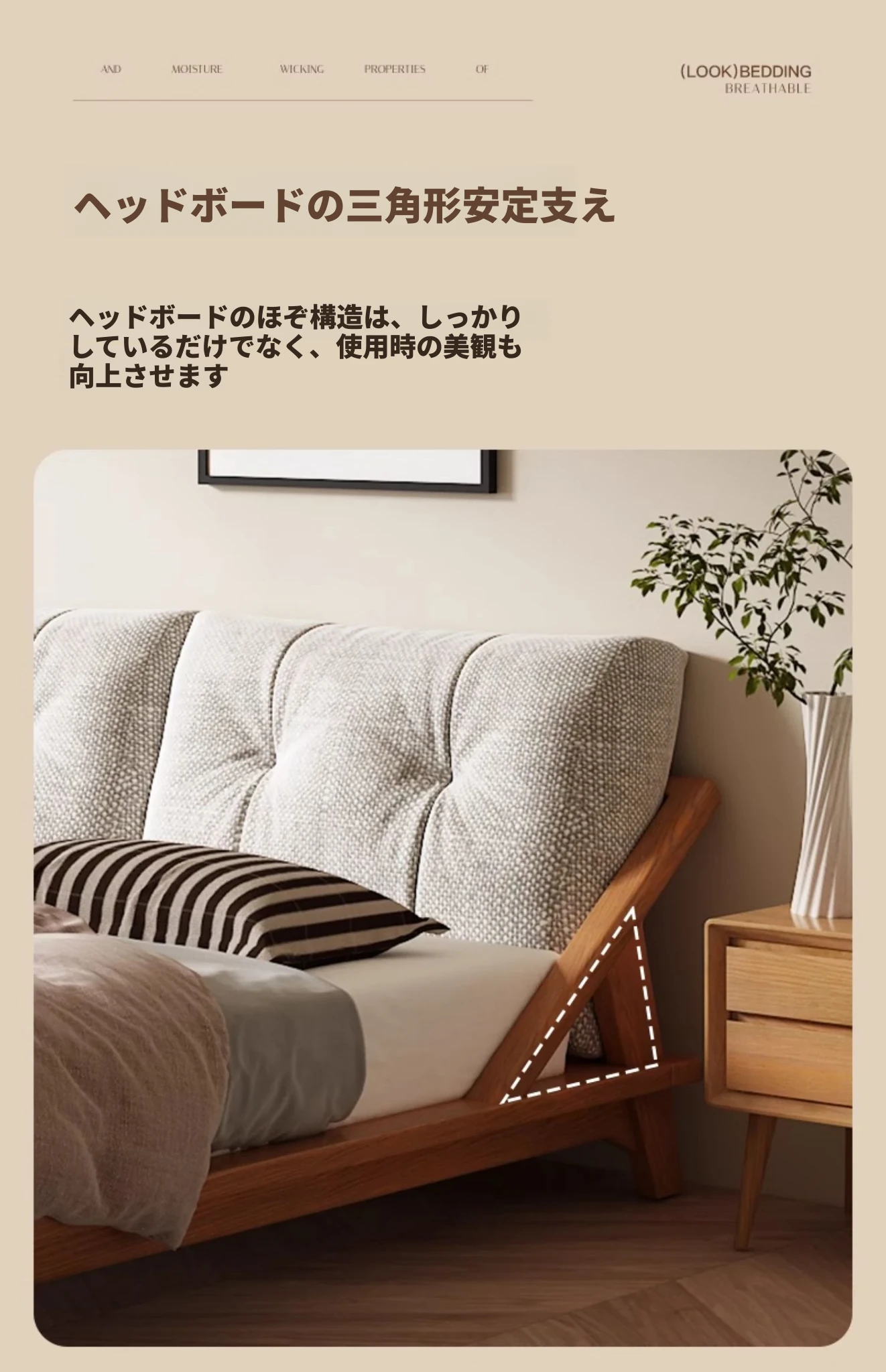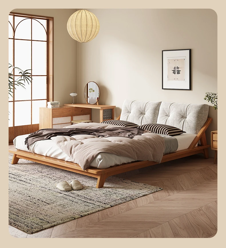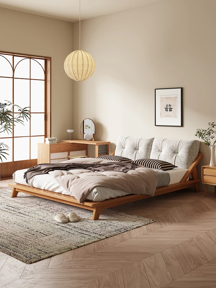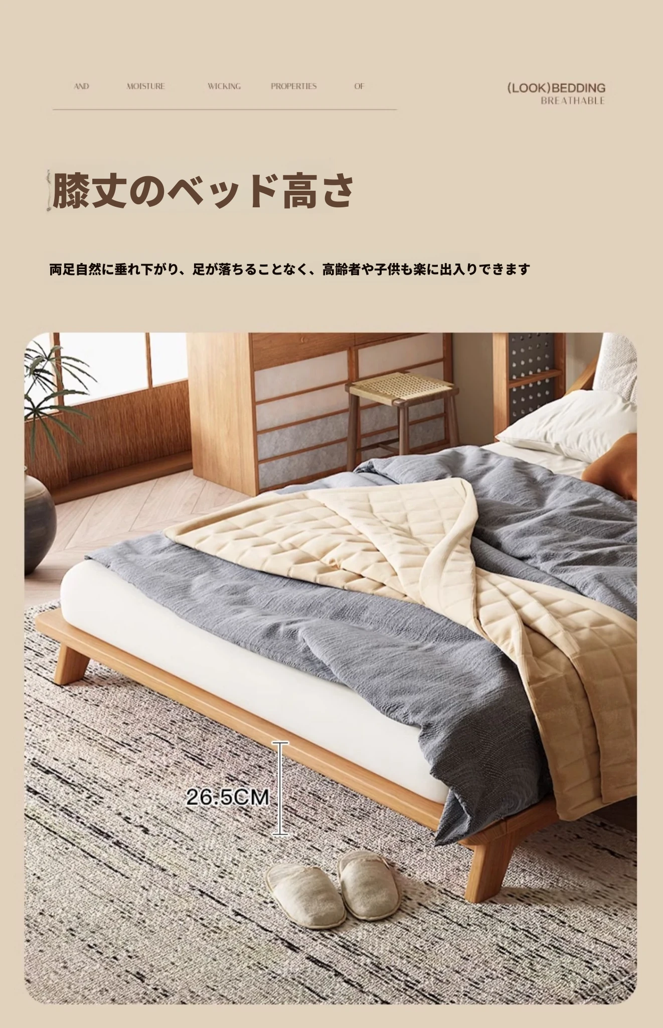 日本風の天然木製1.8mベッド - ナチュラルクリームカラーの低床フレーム、主寝室や小型住宅に最適なホワイトアッシュの畳スタイルダブルベッド。快適さとスタイルを両立した理想の寝具!