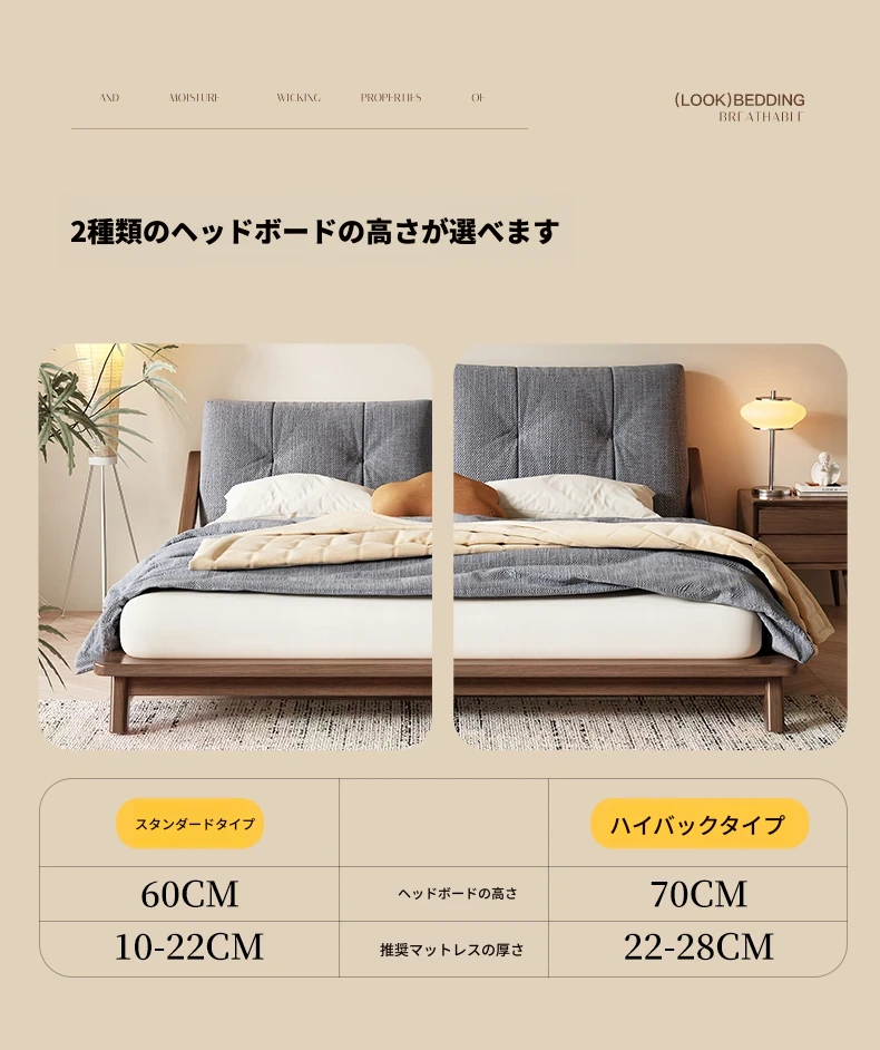 【マットレスセット価格-ビーチウッドスラット】グレーのコットンリネン高背クッション+ラテックスマットレス(22cm)#B01