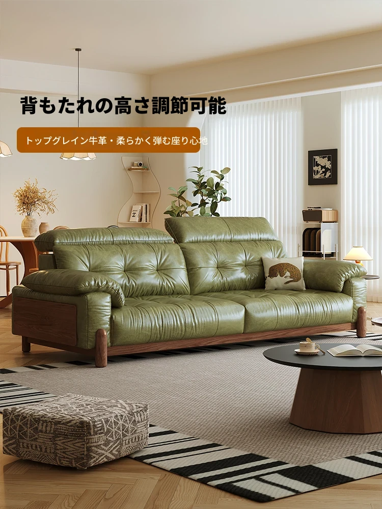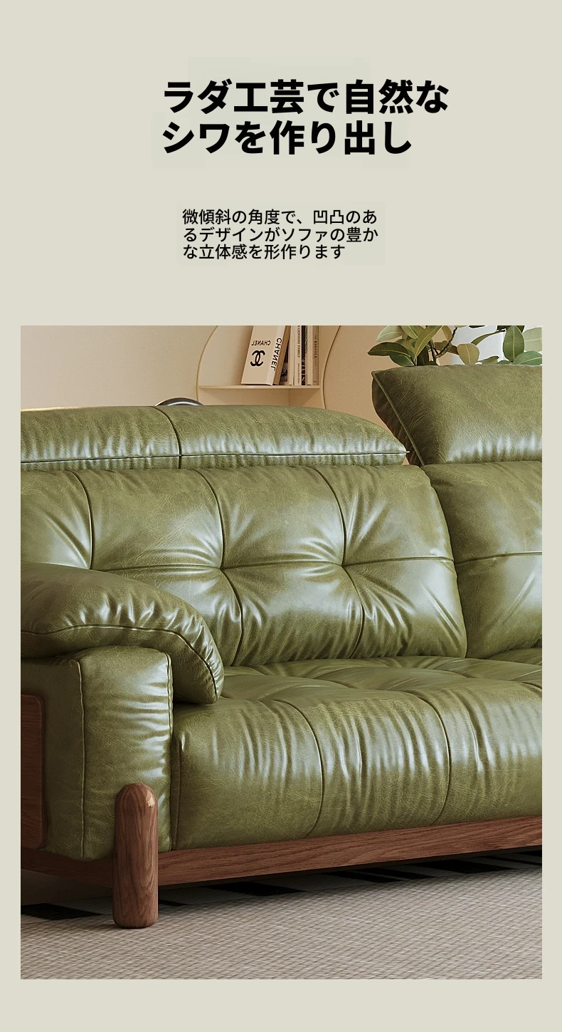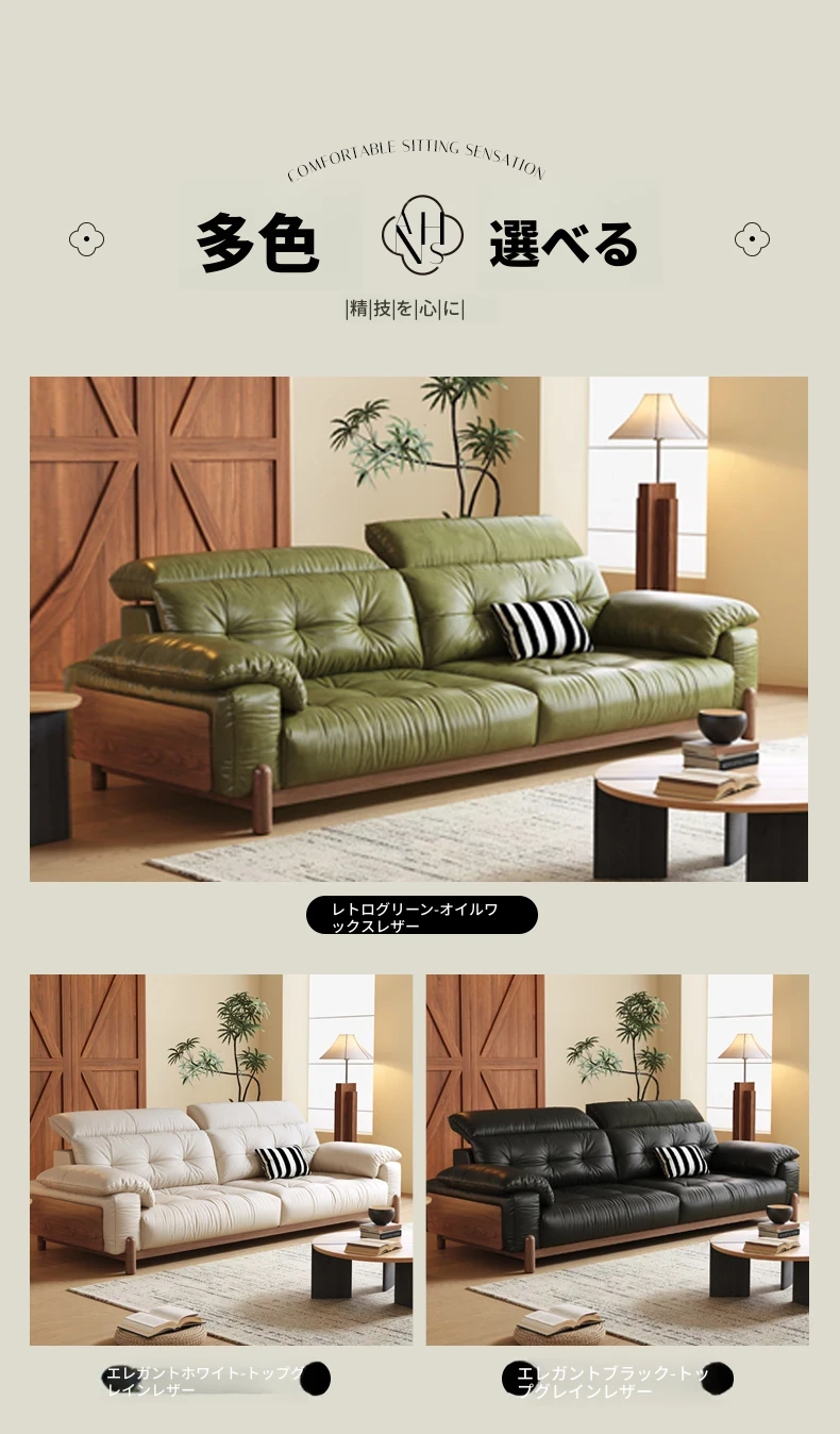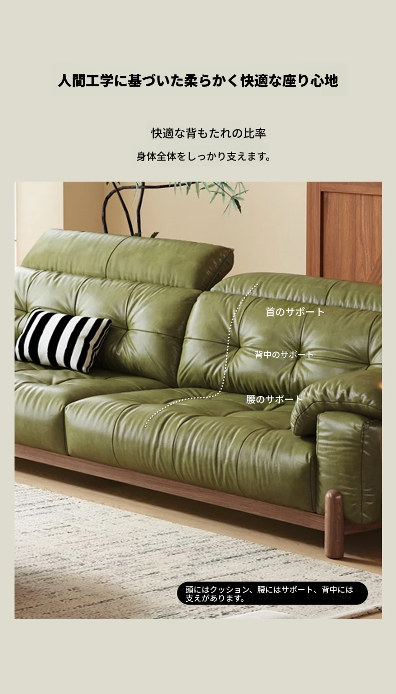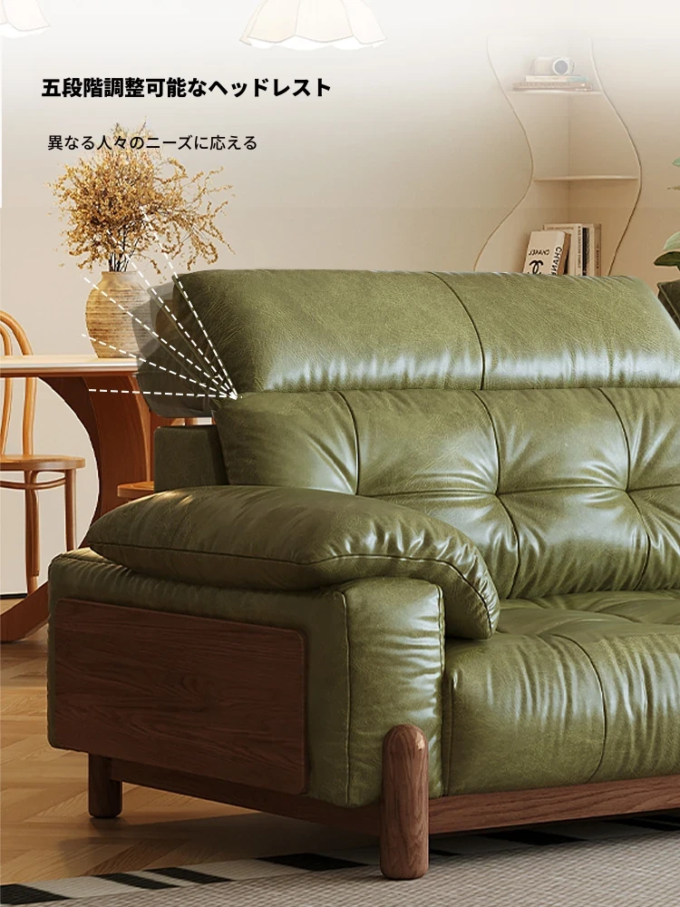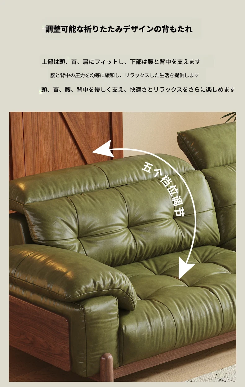 2025年新作!レトロデザインの本革ソファ - グリーンのトップグレイン牛革使用、調節可能な背もたれで快適なリビング空間を演出。高品質の無垢材フレームで、耐久性も抜群!あなたの家にぴったりのスタイルを。