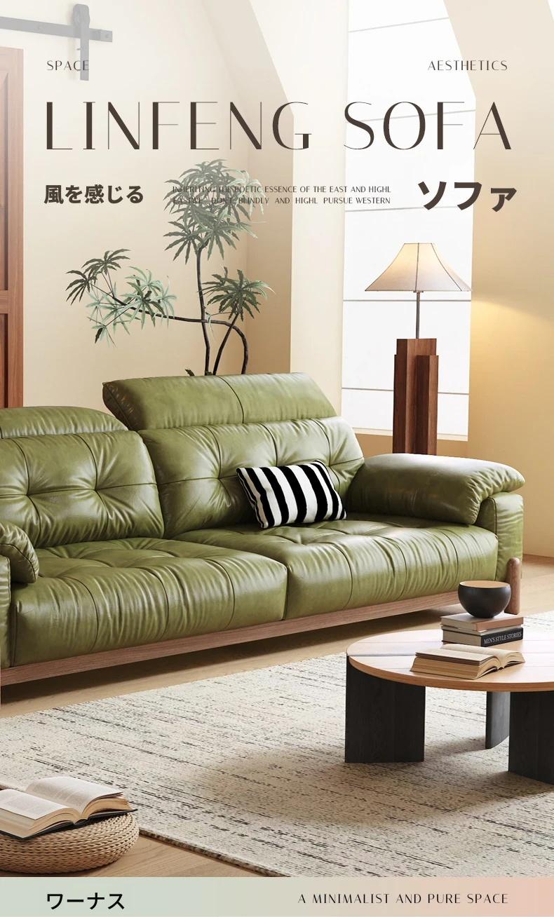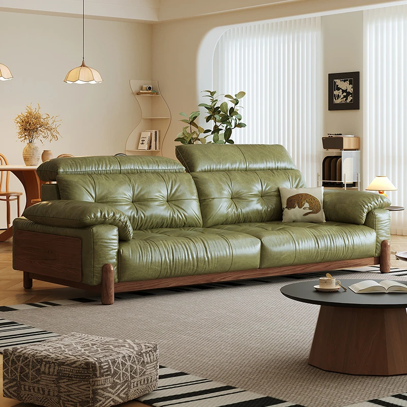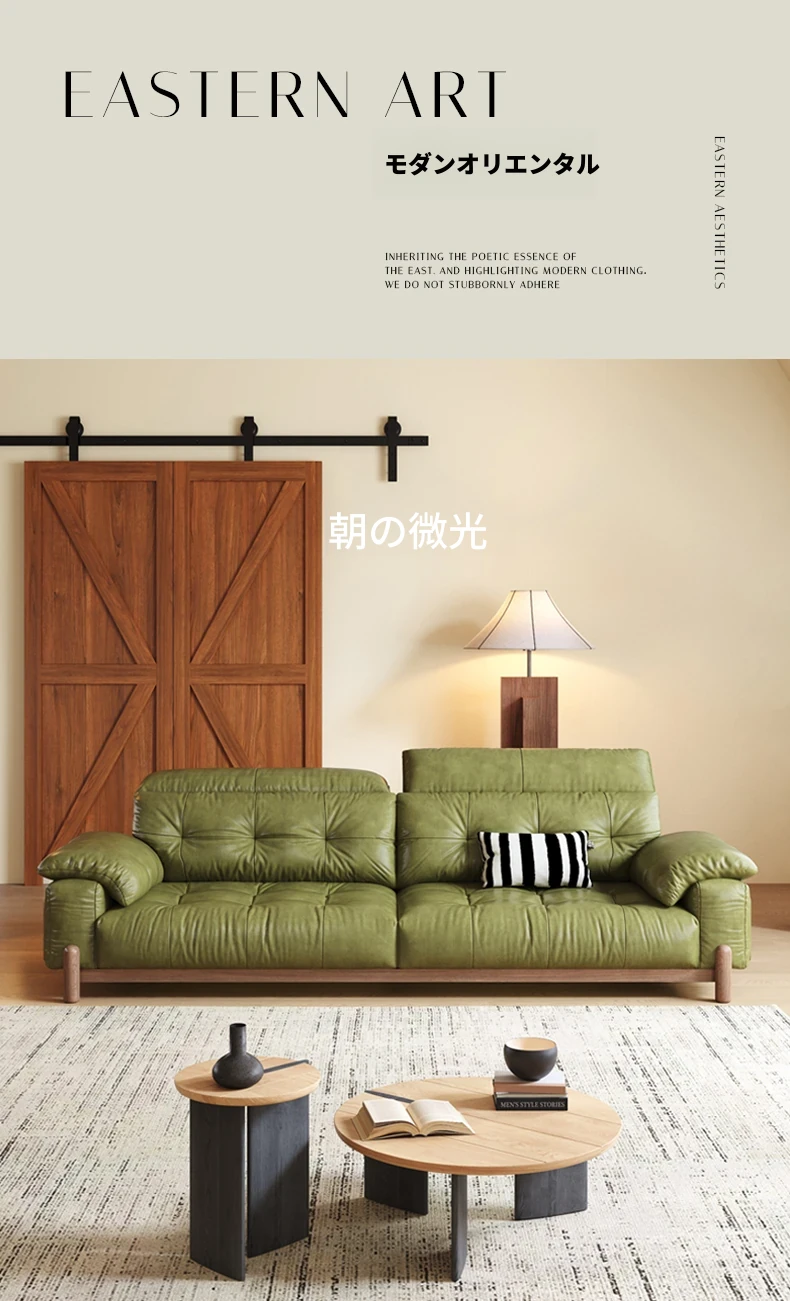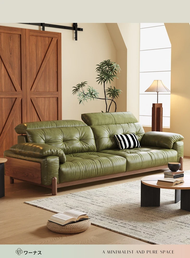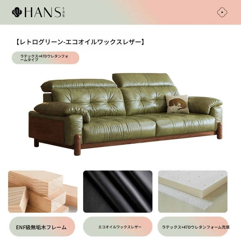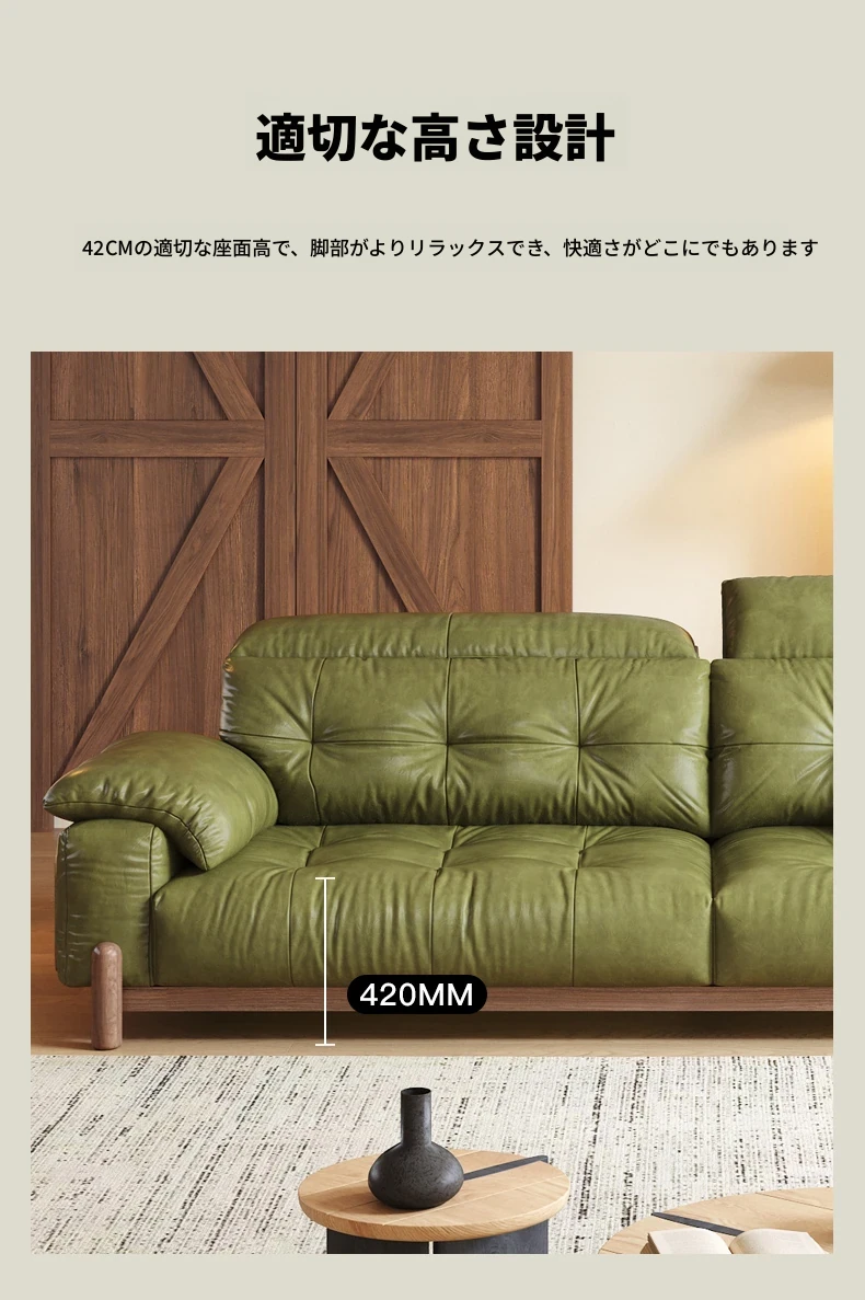 2025年新作!レトロデザインの本革ソファ - グリーンのトップグレイン牛革使用、調節可能な背もたれで快適なリビング空間を演出。高品質の無垢材フレームで、耐久性も抜群!あなたの家にぴったりのスタイルを。