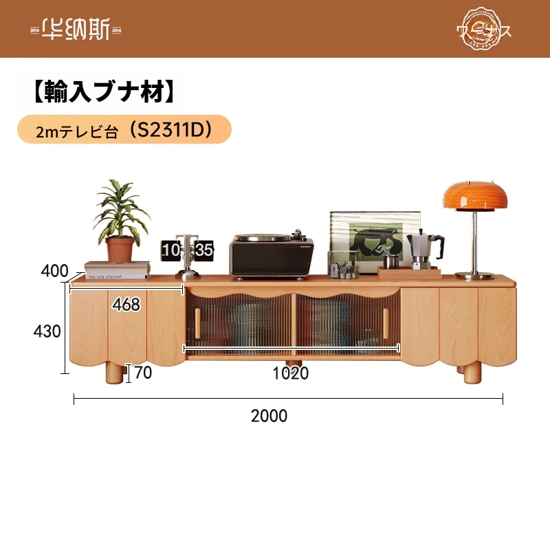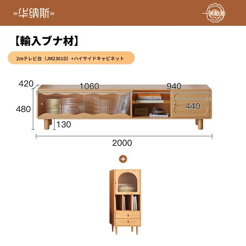 2mブナ材テレビキャビネット(JM2301D)+無垢材棚付きハイサイドキャビネット(S2111N)
