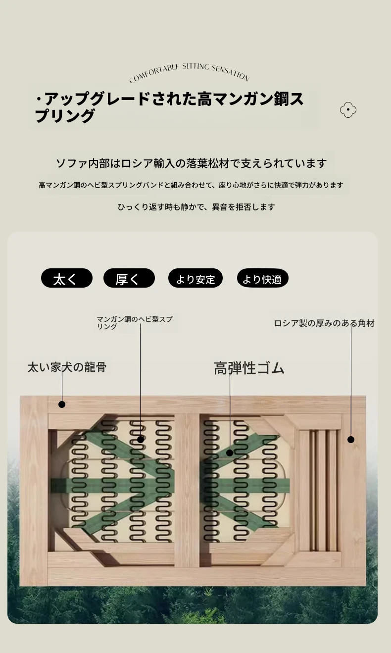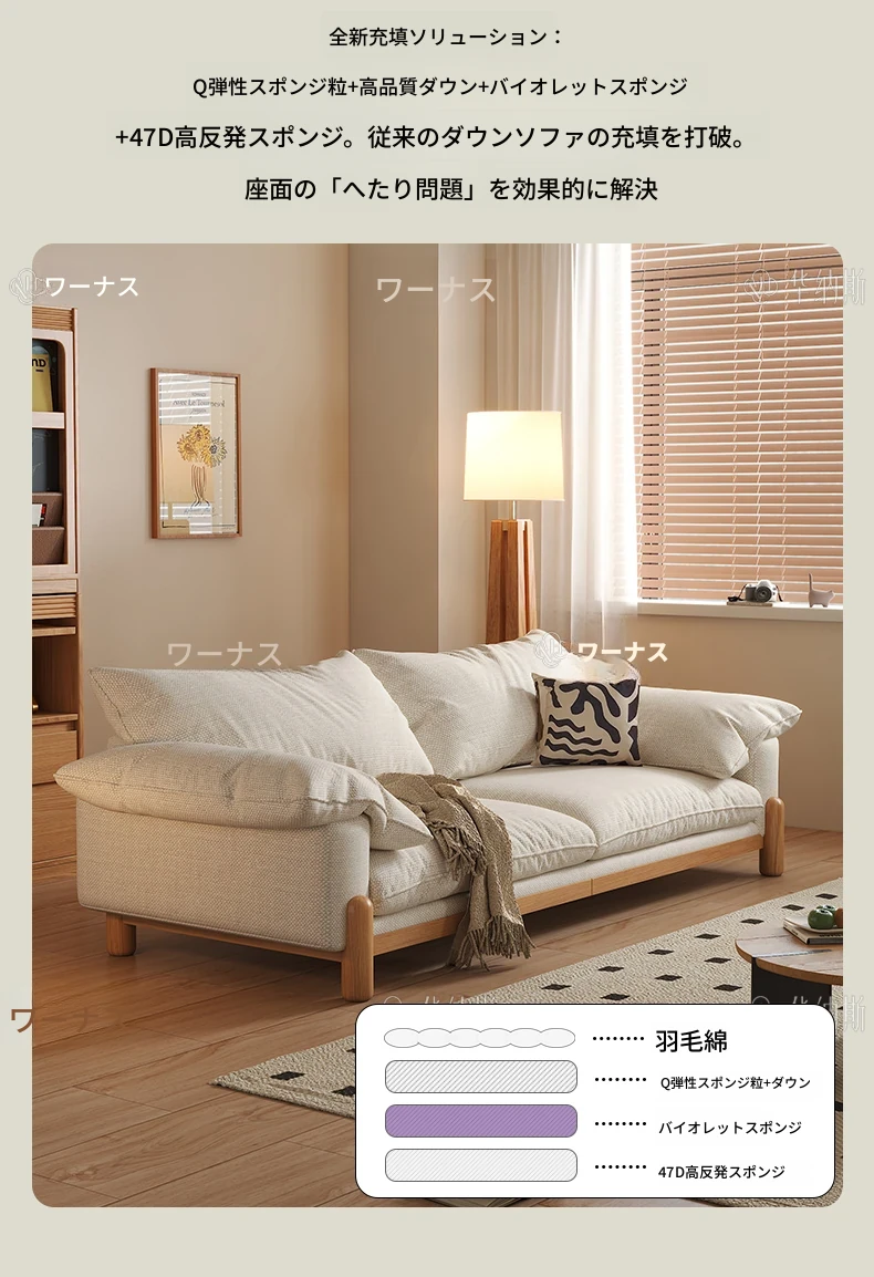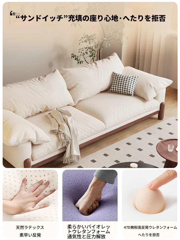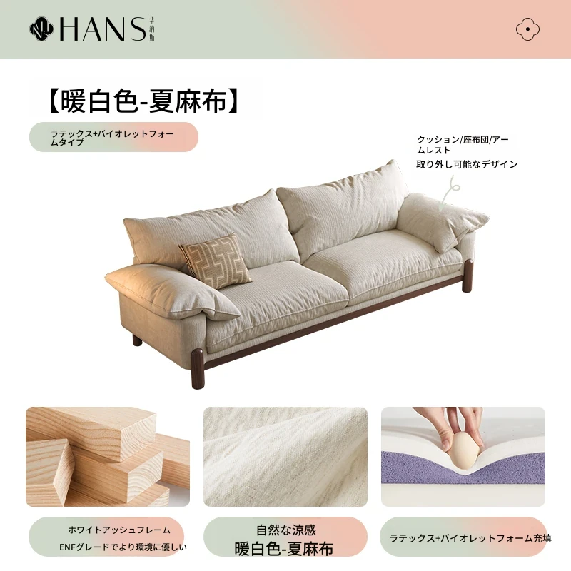 【新しくアップグレード】豪華版-Q弾性座感【ウォームホワイト-天然夏麻布】ラテックス+バイオレットスポンジ+ホワイトウッドフレーム