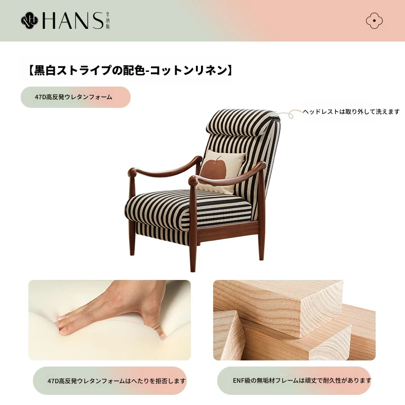 【輸入北米ホワイトアッシュソファチェア】ブラックホワイトストライプバイカラー-コットンリネンアップグレードヘッドレスト取り外し可能
