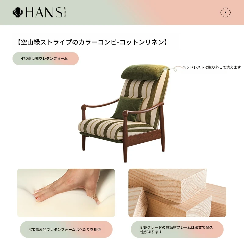 【輸入北米ホワイトアッシュソファチェア】空山グリーン-ストライプバイカラー-コットンリネン/アップグレードメモリーフォーム充填アップグレードヘッドレスト取り外し可能