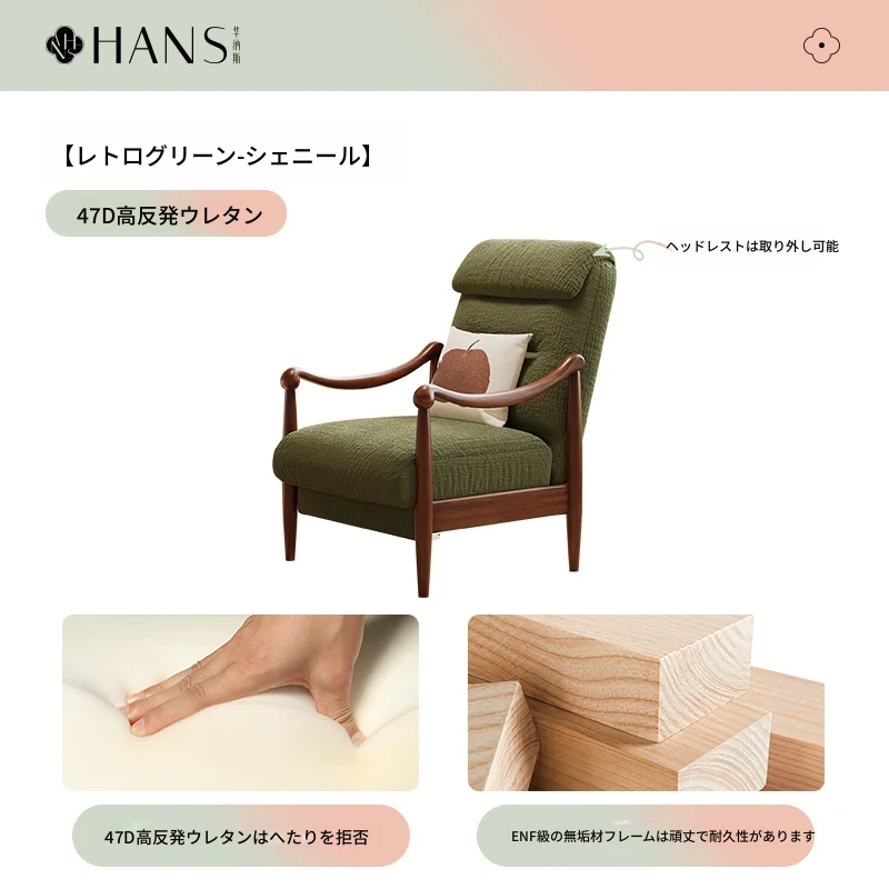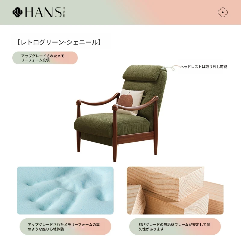 【輸入北米ホワイトアッシュソファチェア】ヴィンテージグリーン-シェニール/アップグレードメモリーフォーム充填アップグレードヘッドレスト取り外し可能