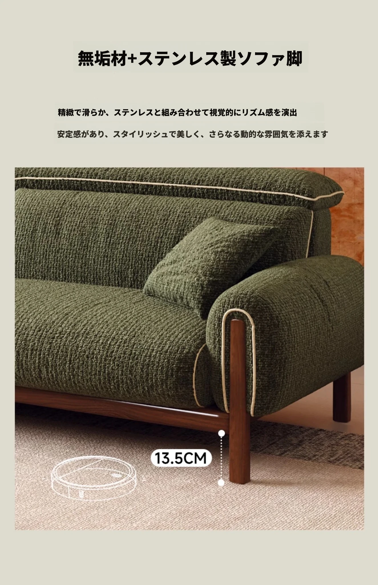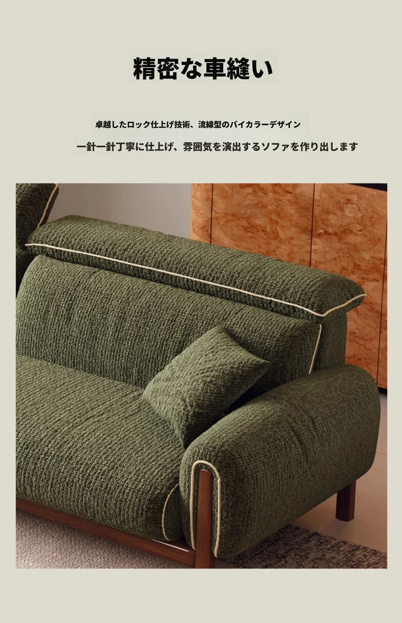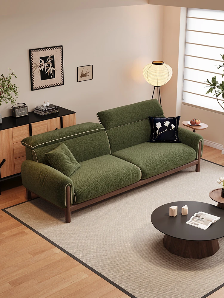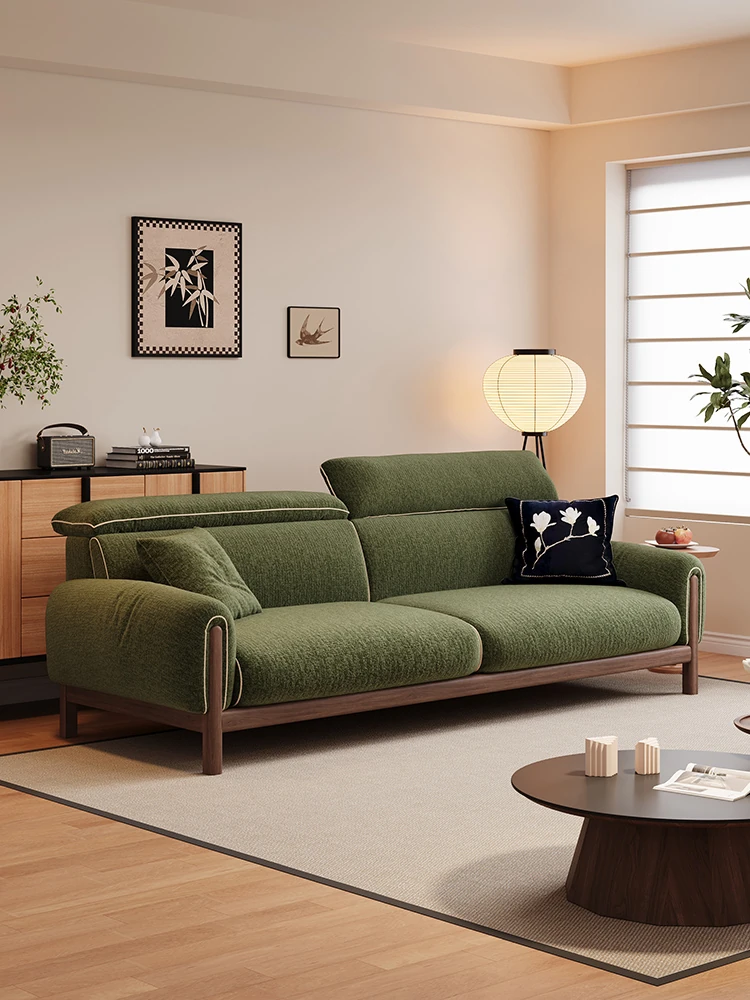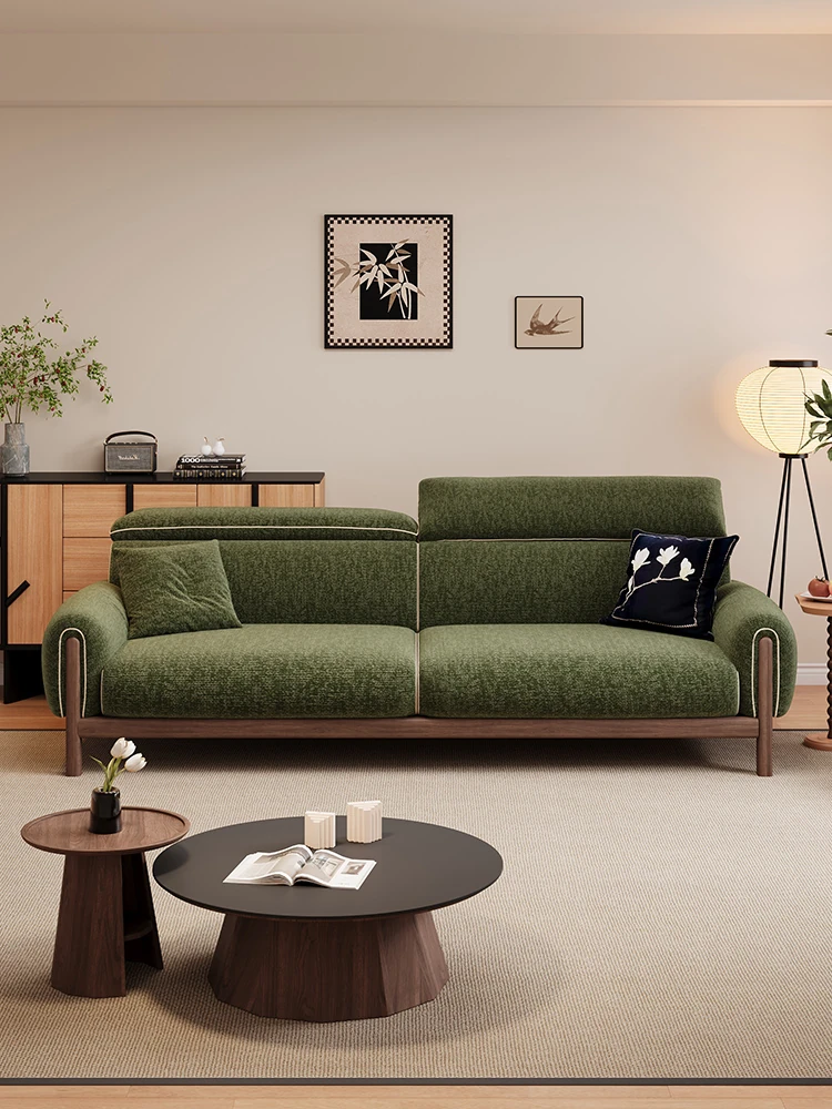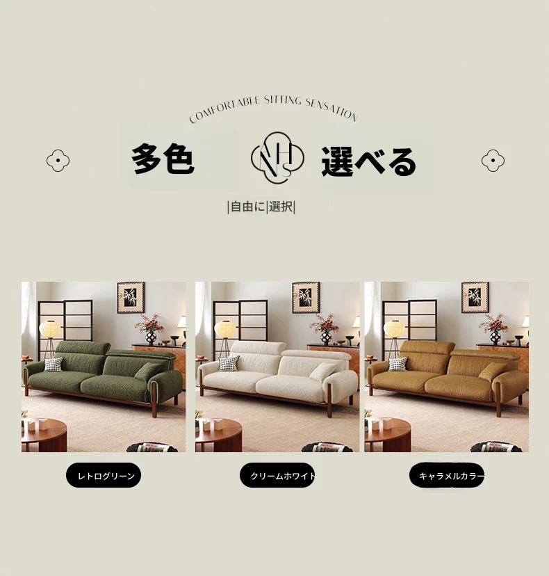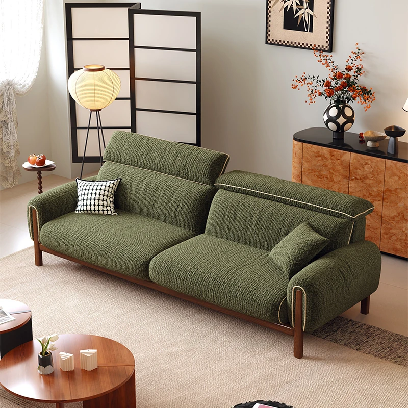ワーナス・ロスのレトロスタイル、スノーウールファブリック、無垢材使用の小型リビングソファ。2025年新作、直線デザインでグリーンカラー!おしゃれでコンパクトな空間にぴったりです。