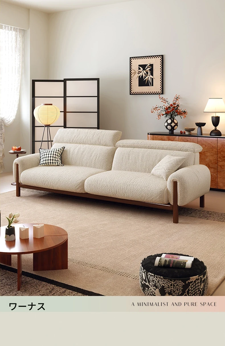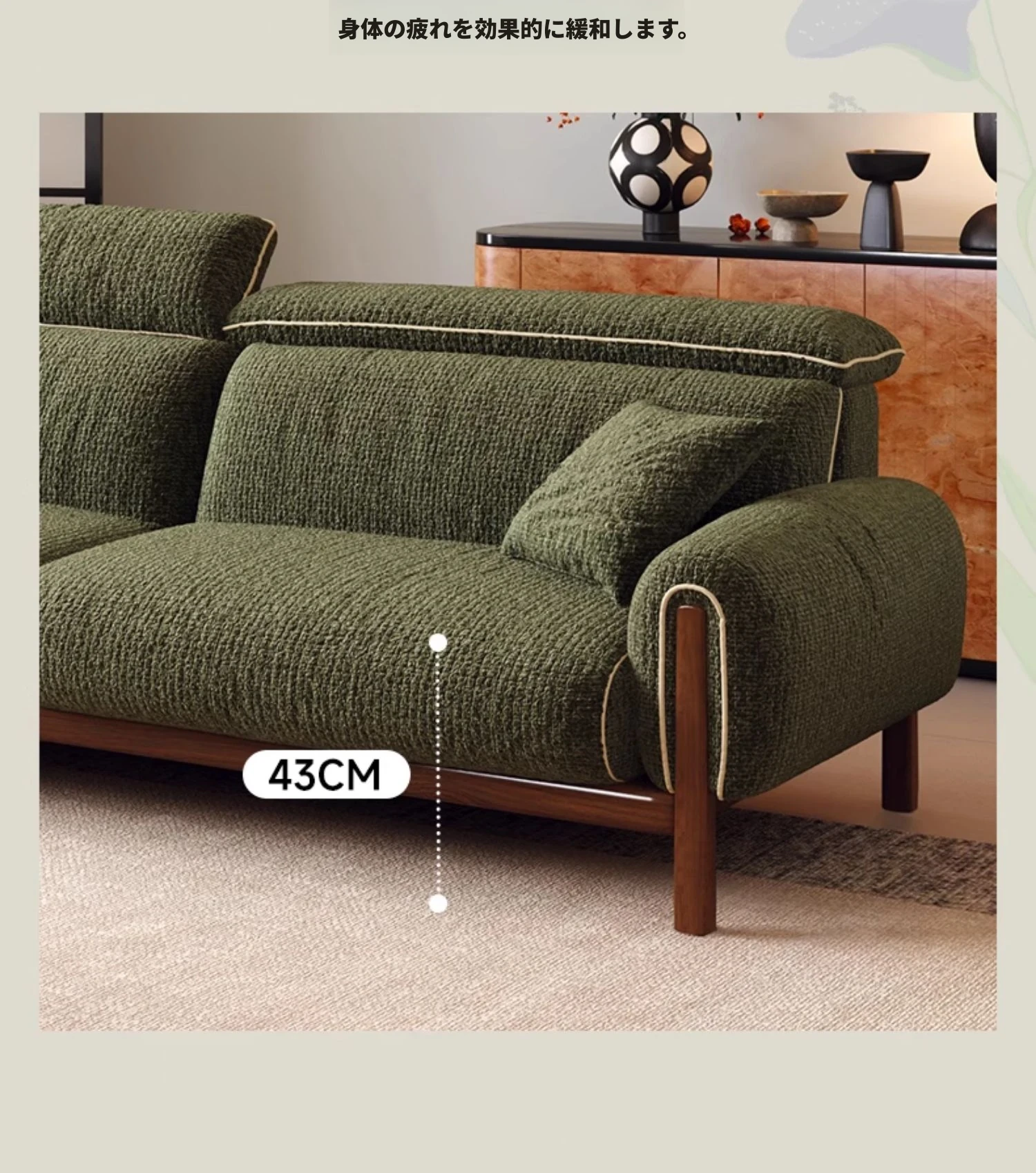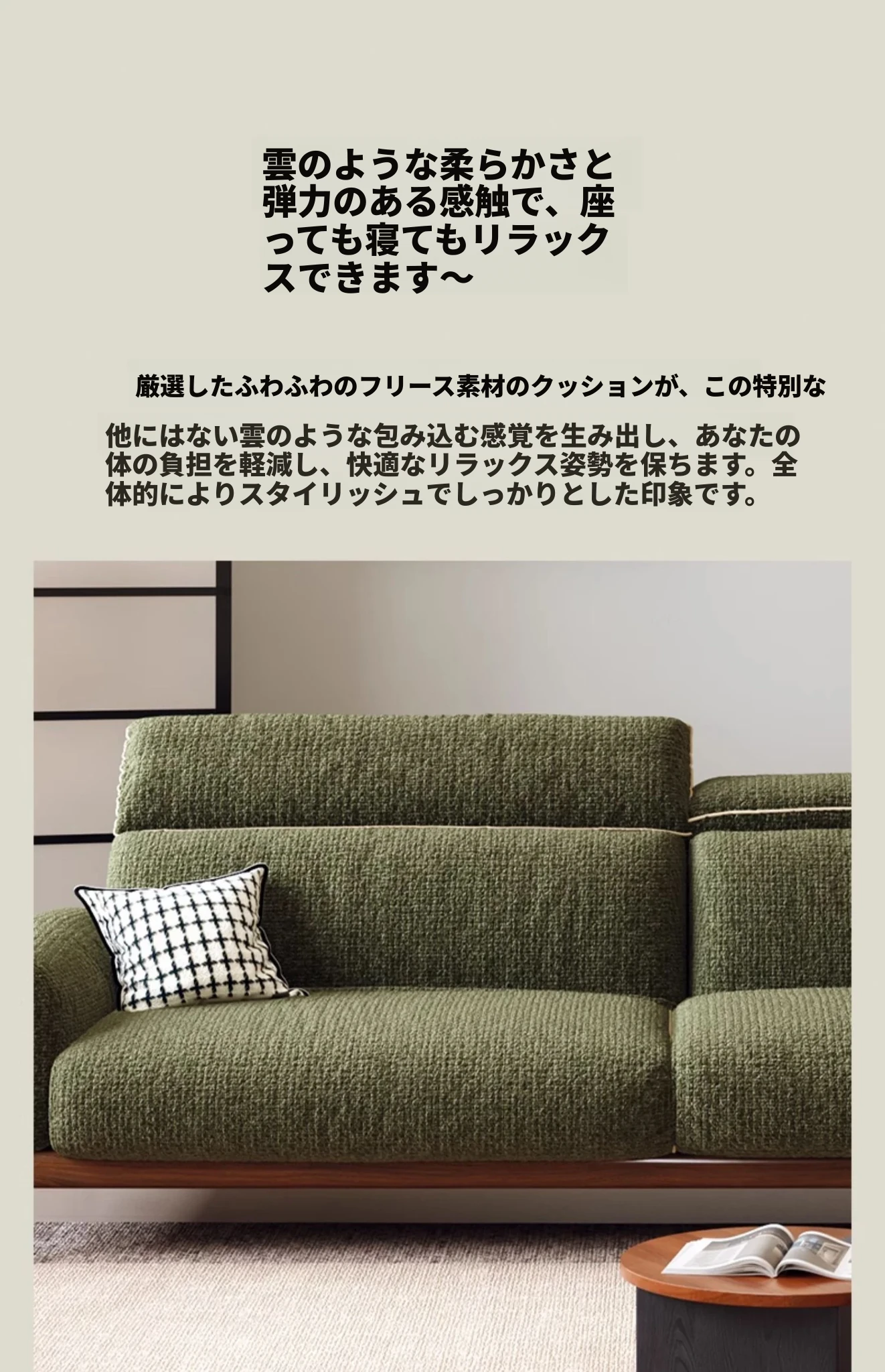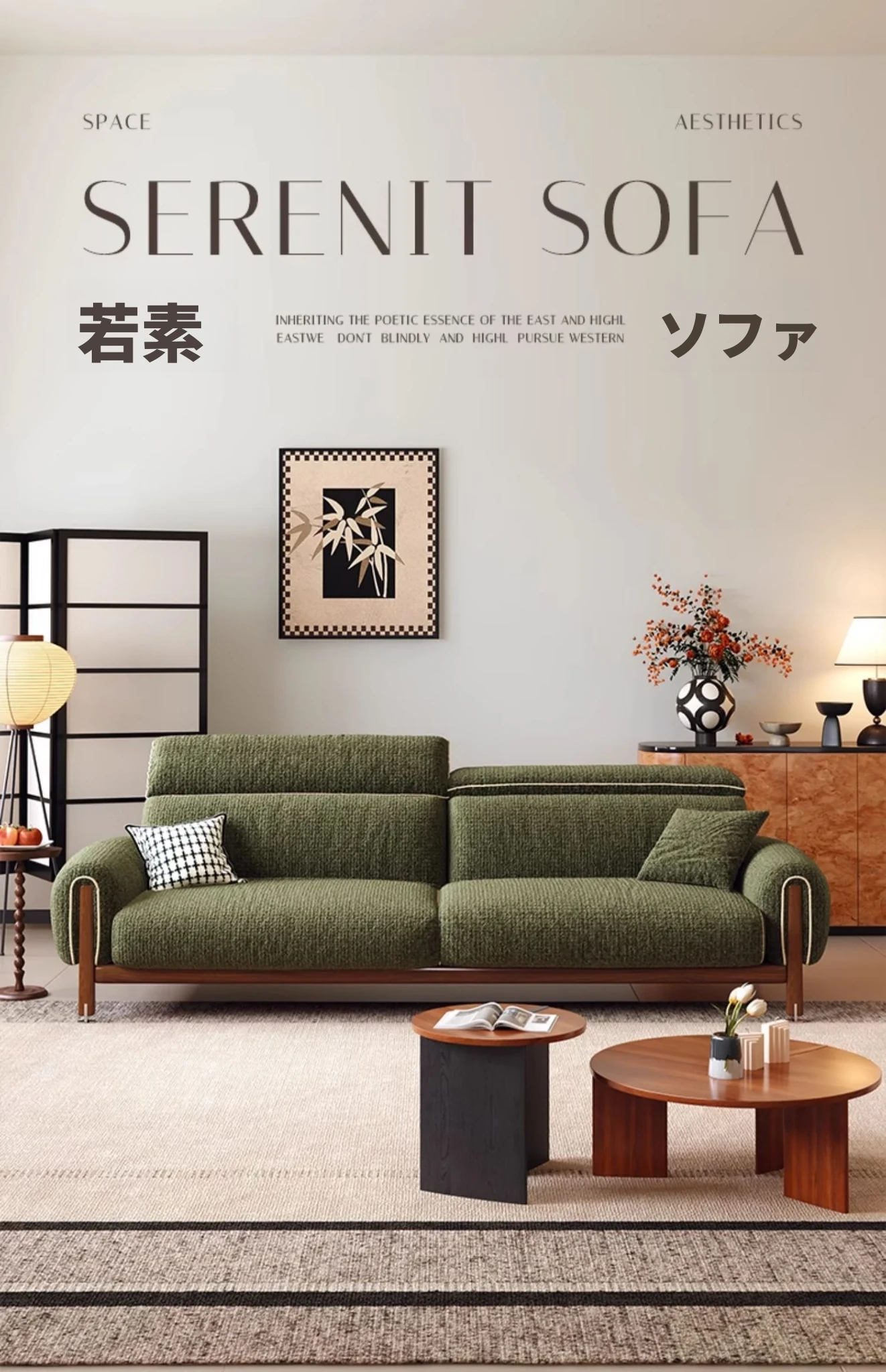 ワーナス・ロスのレトロスタイル、スノーウールファブリック、無垢材使用の小型リビングソファ。2025年新作、直線デザインでグリーンカラー!おしゃれでコンパクトな空間にぴったりです。