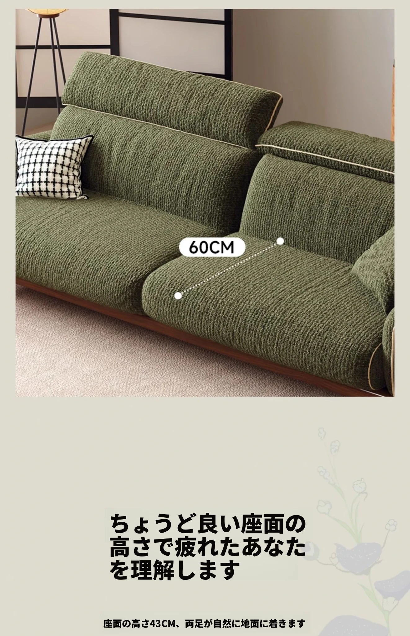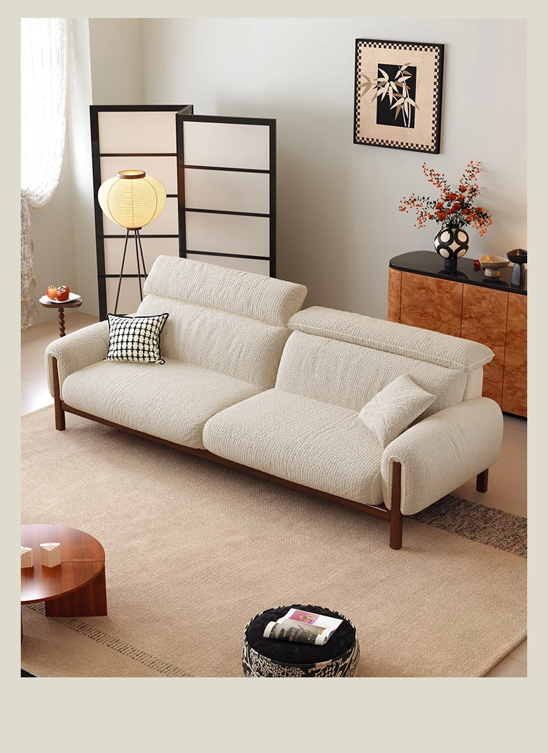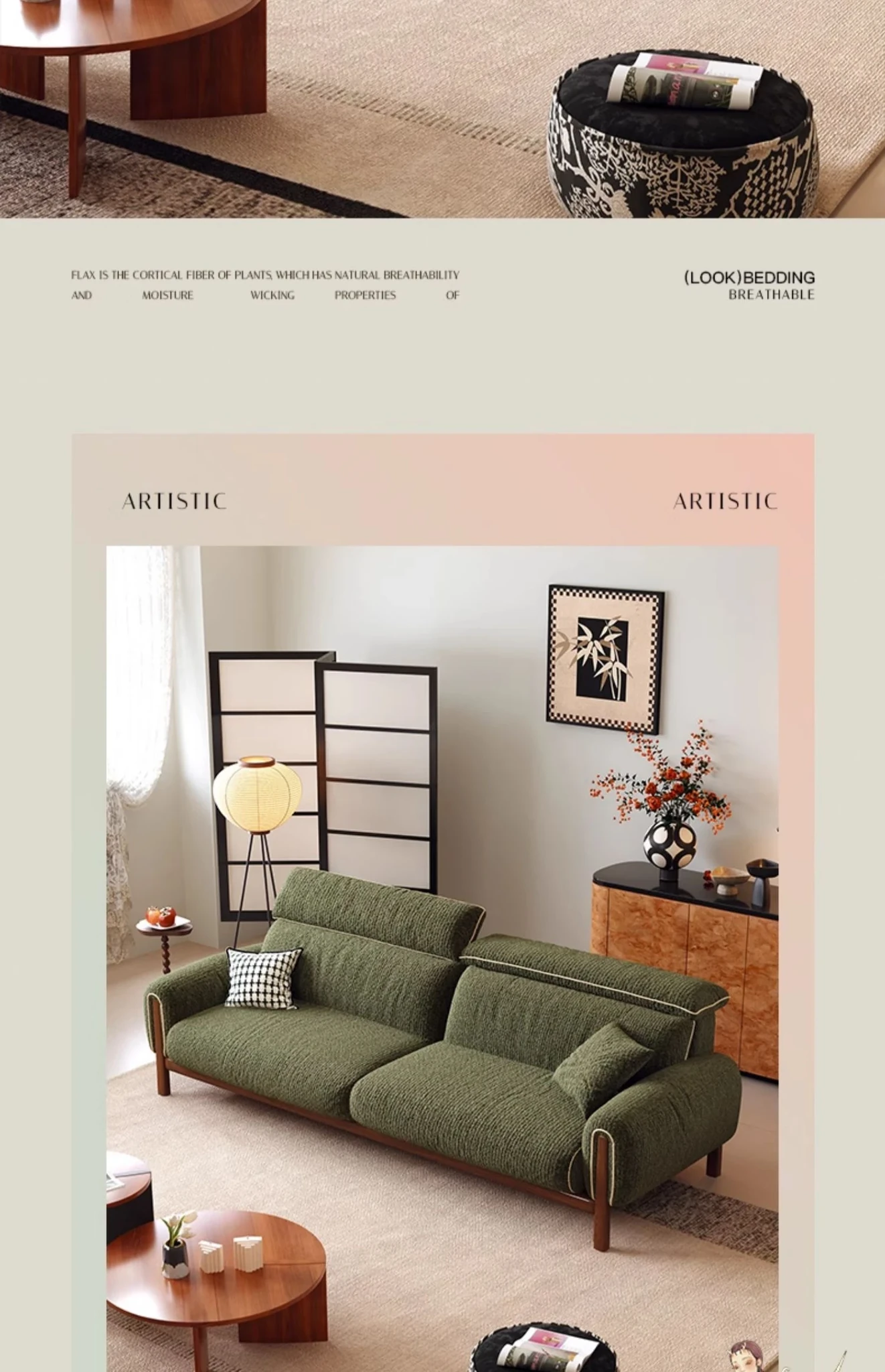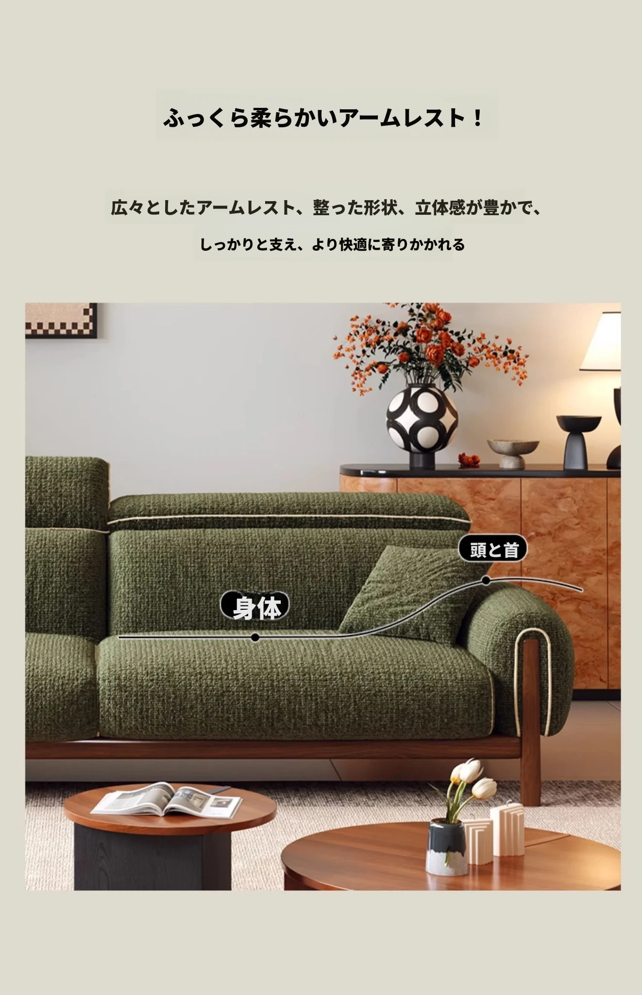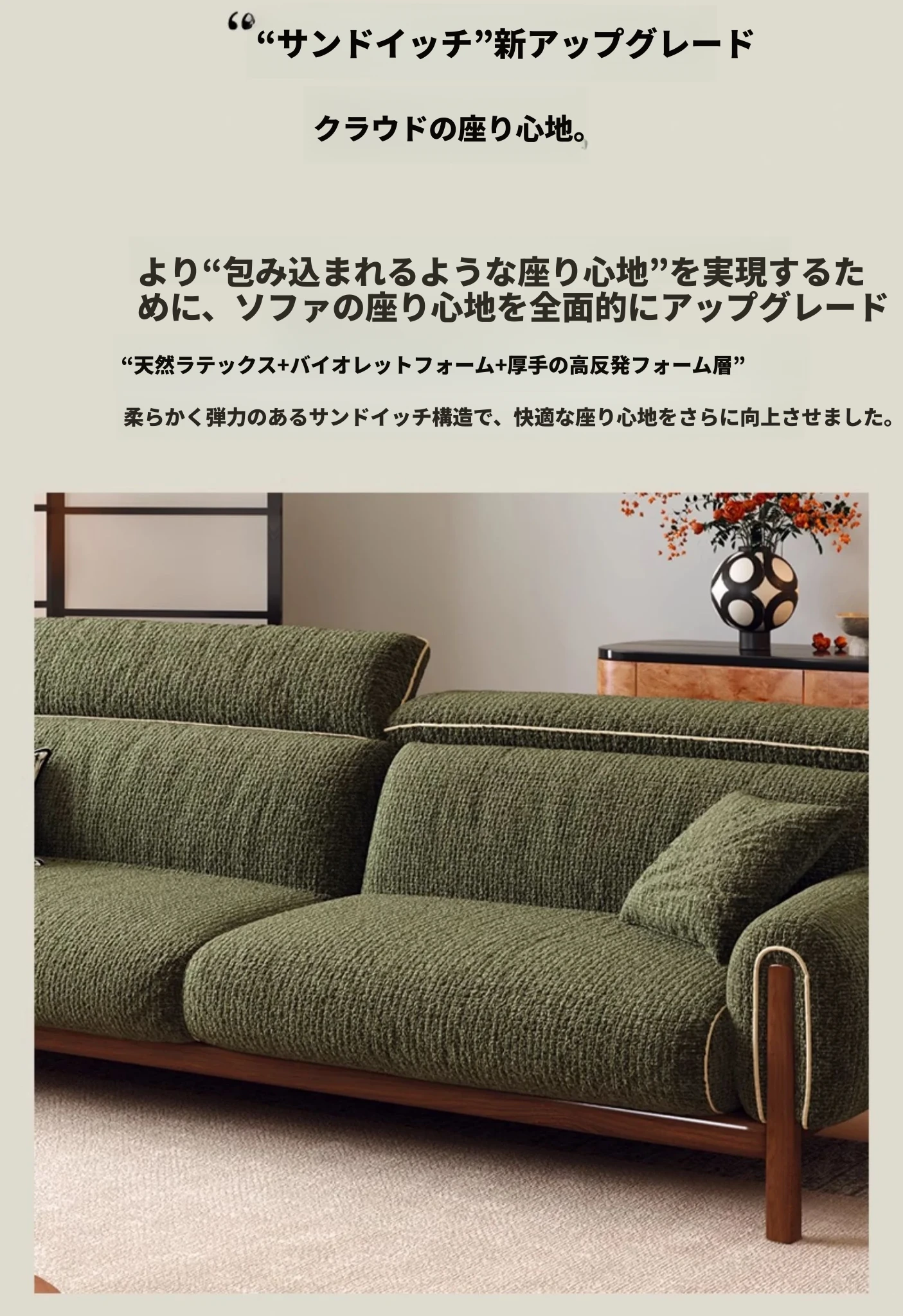 ワーナス・ロスのレトロスタイル、スノーウールファブリック、無垢材使用の小型リビングソファ。2025年新作、直線デザインでグリーンカラー!おしゃれでコンパクトな空間にぴったりです。