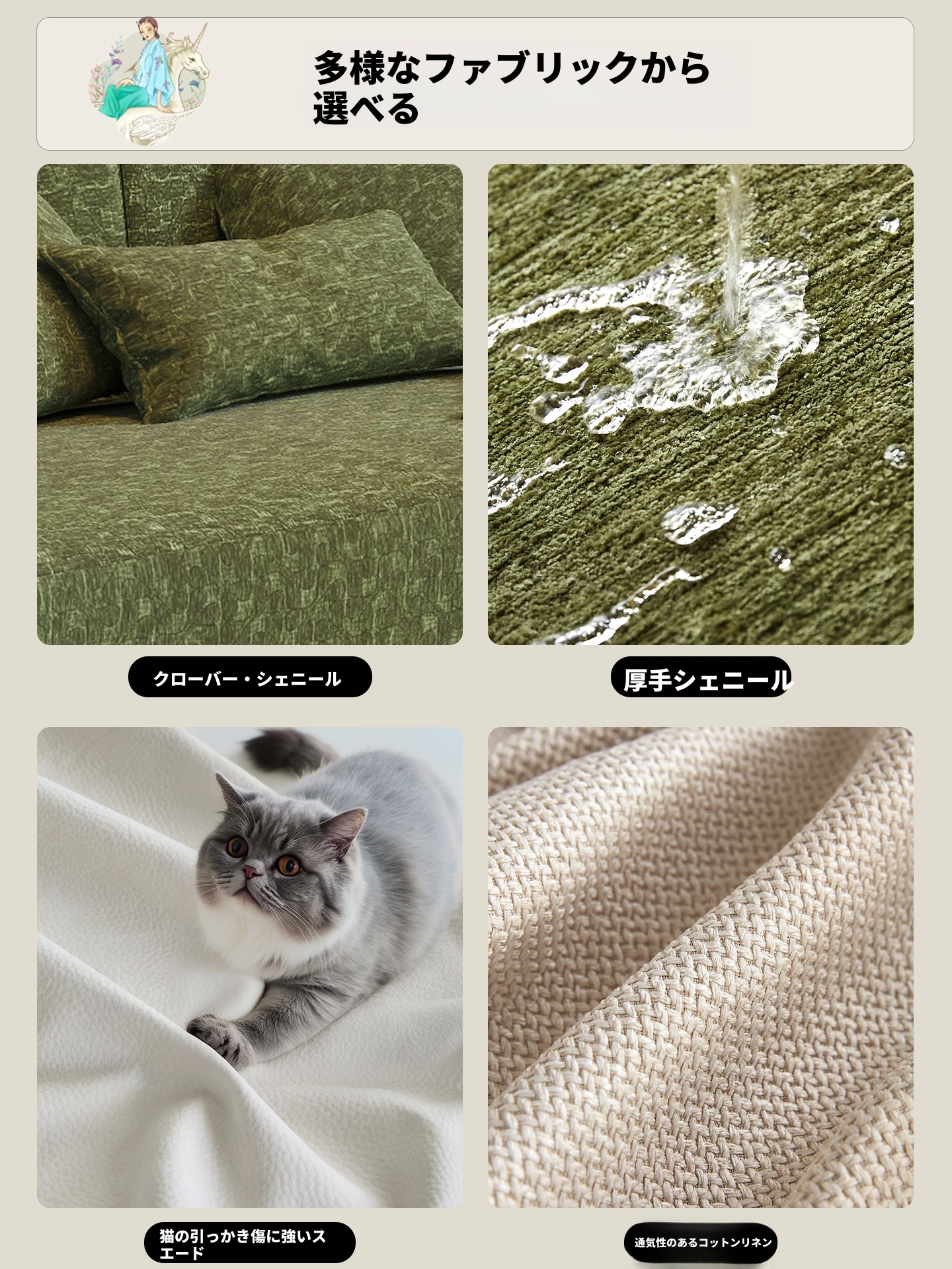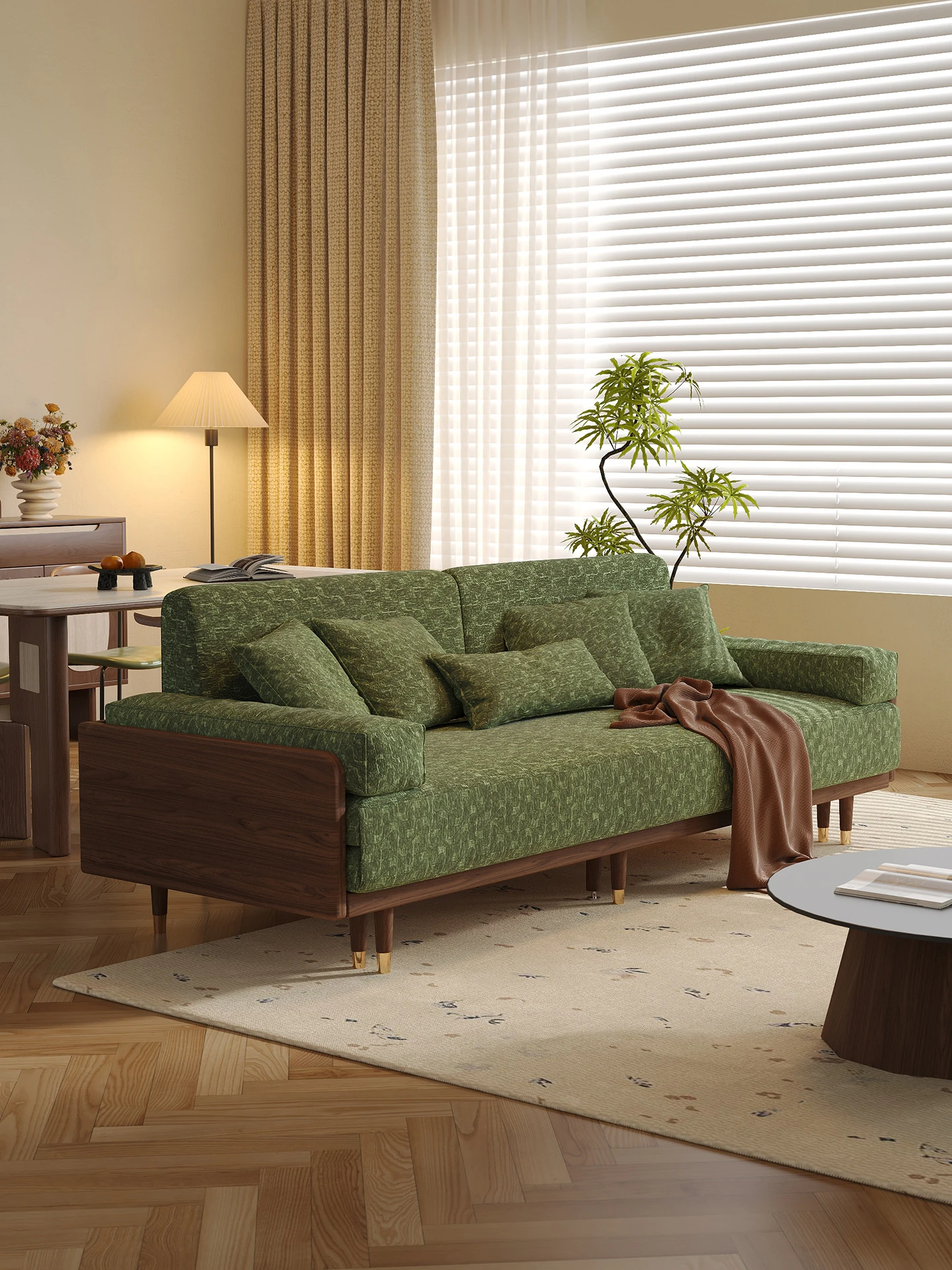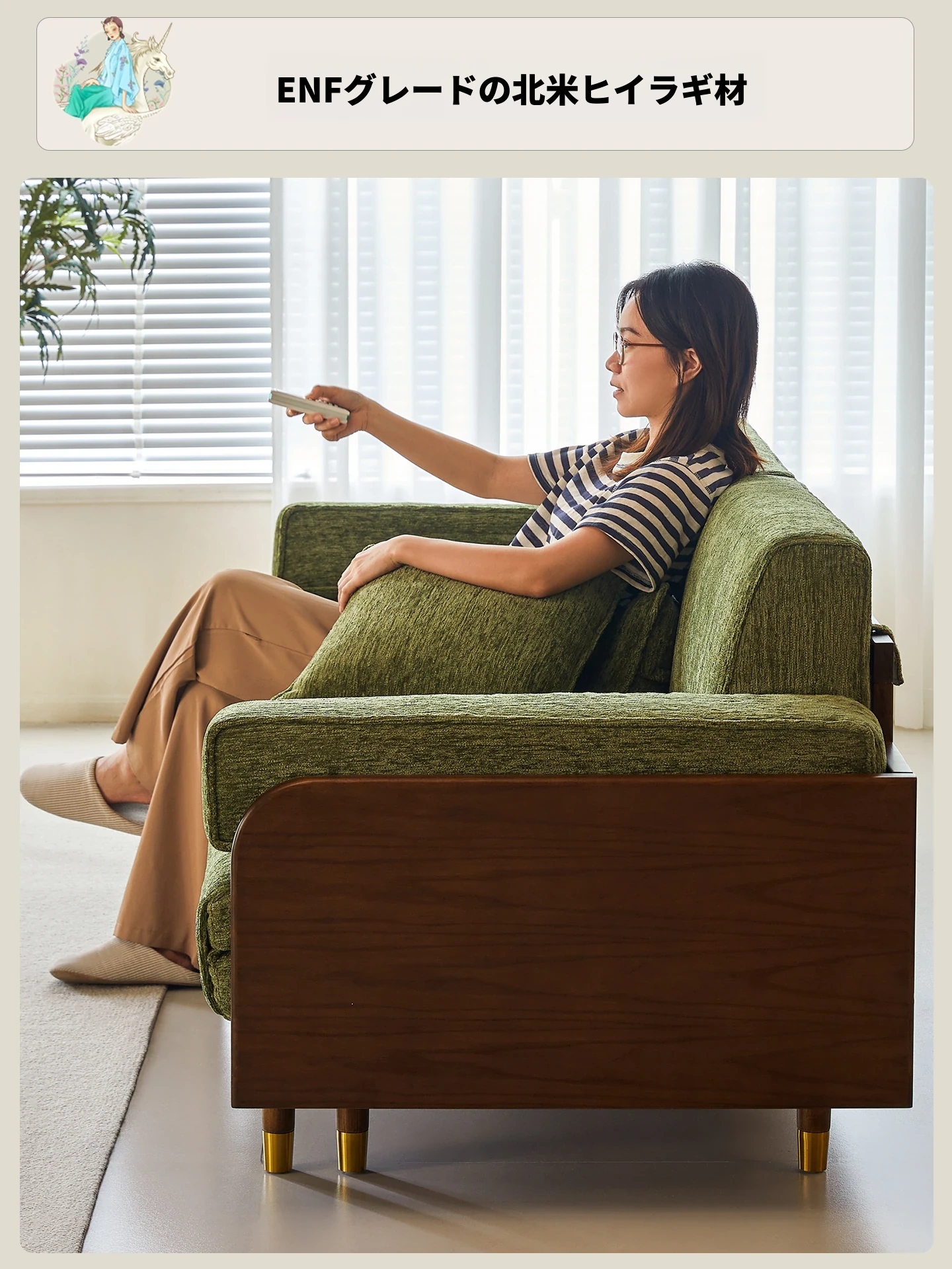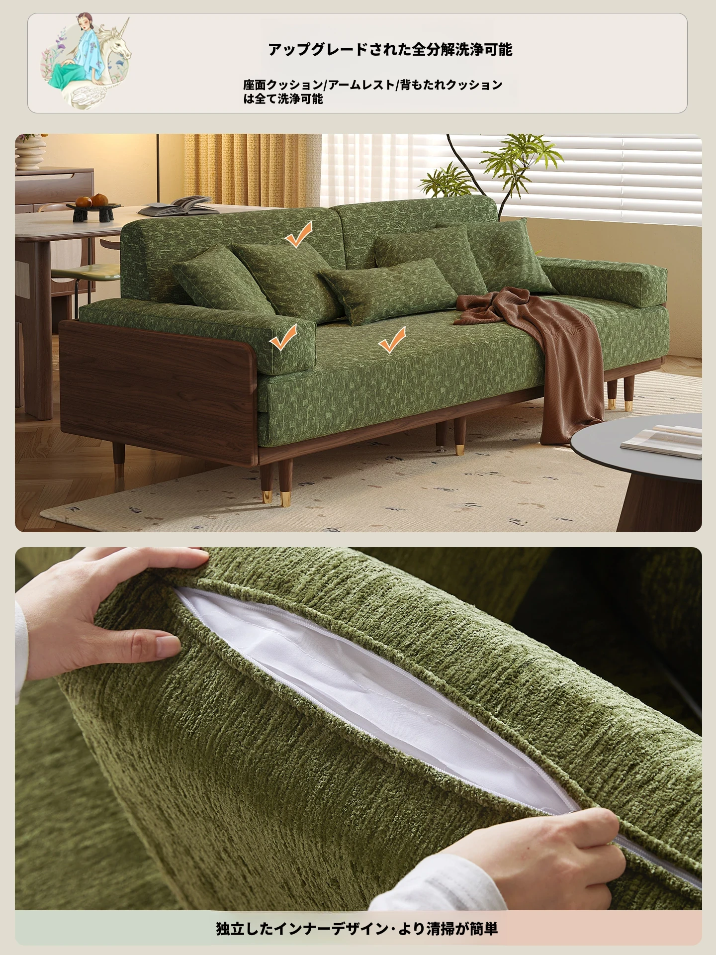 2.07m【抹茶グリーン・シェニール+バイオレット・スポンジ+全白ワックスウッド/ウォールナット色フレーム】