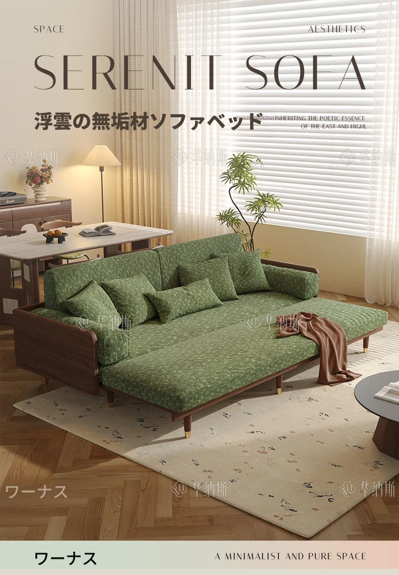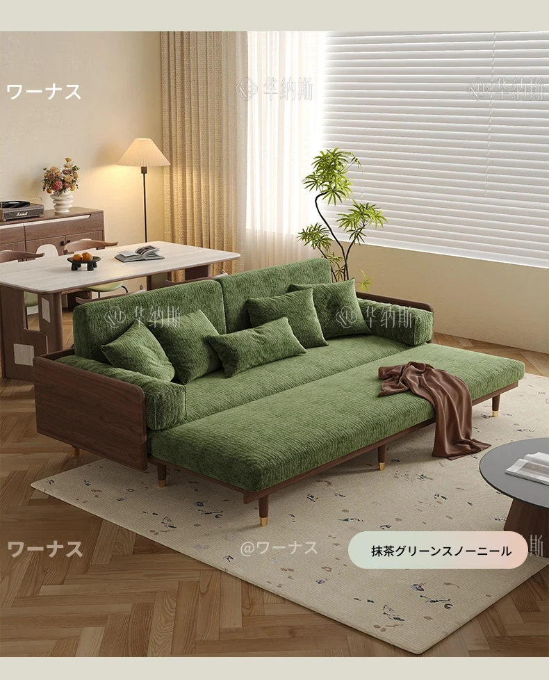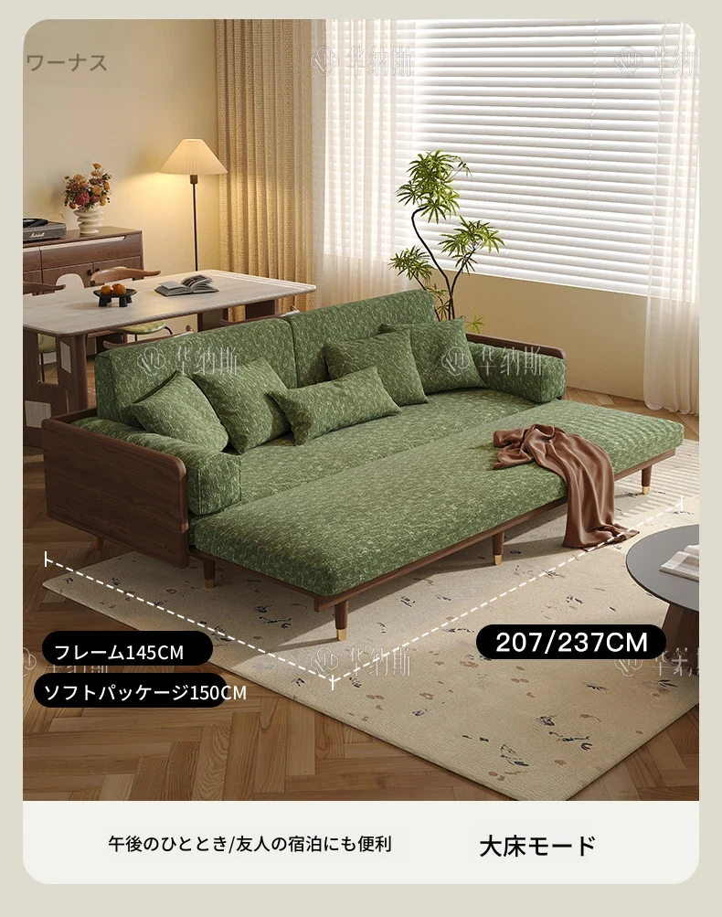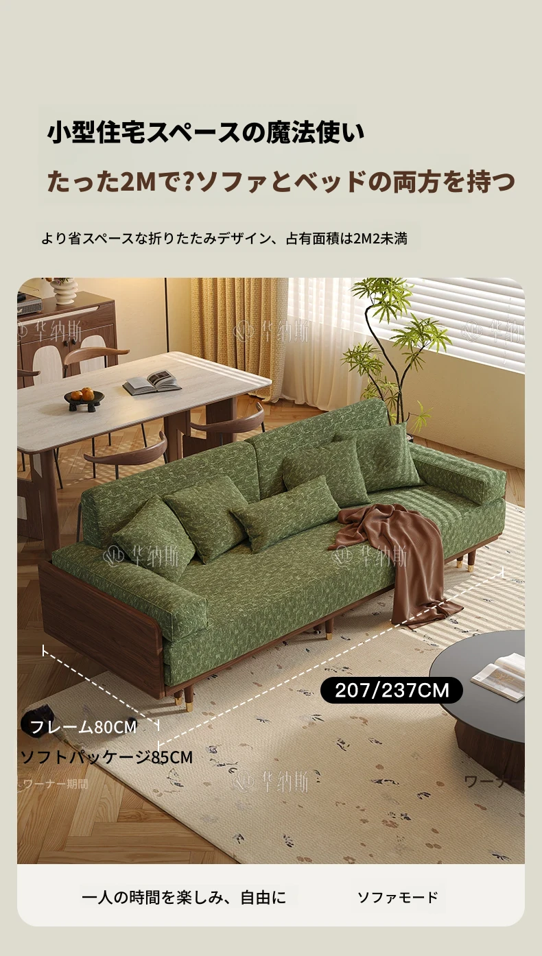 ワーナスの伸縮式ソファベッド - 新型2025年、実木製で折りたたみ可能!小さなリビングにもぴったりのグリーンカラーで、長期的な快適な睡眠をサポートします。おしゃれで機能的な空間を実現しましょう!