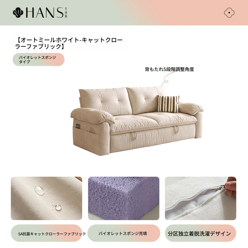 豪華版【オートミールホワイト-キャットクロー生地】バイオレットスポンジタイプ (ソファベッド、全分解洗浄設計)