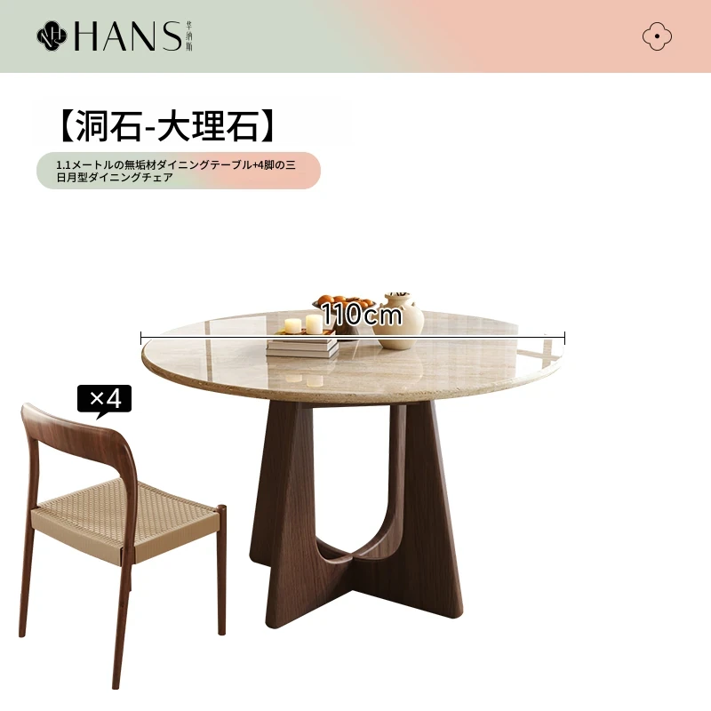 1.1メートル白樺木ダイニングテーブル【洞石模様-大理石/光沢】+4脚FWYダイニングチェア