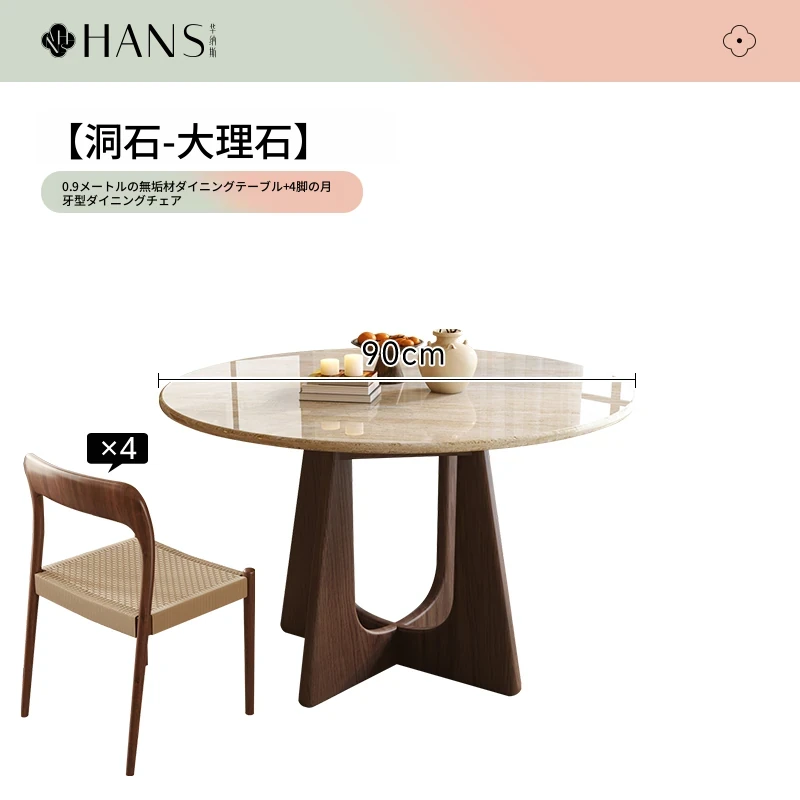 0.9メートル白樺木ダイニングテーブル【洞石模様-大理石/光沢】+4脚FWYダイニングチェア