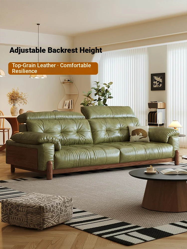 Retro Solid Wood Genuine Leather Sofa - 2025 New Style Green Top-Grain Cowhide Couch with Adjustable Backrest for Living Room