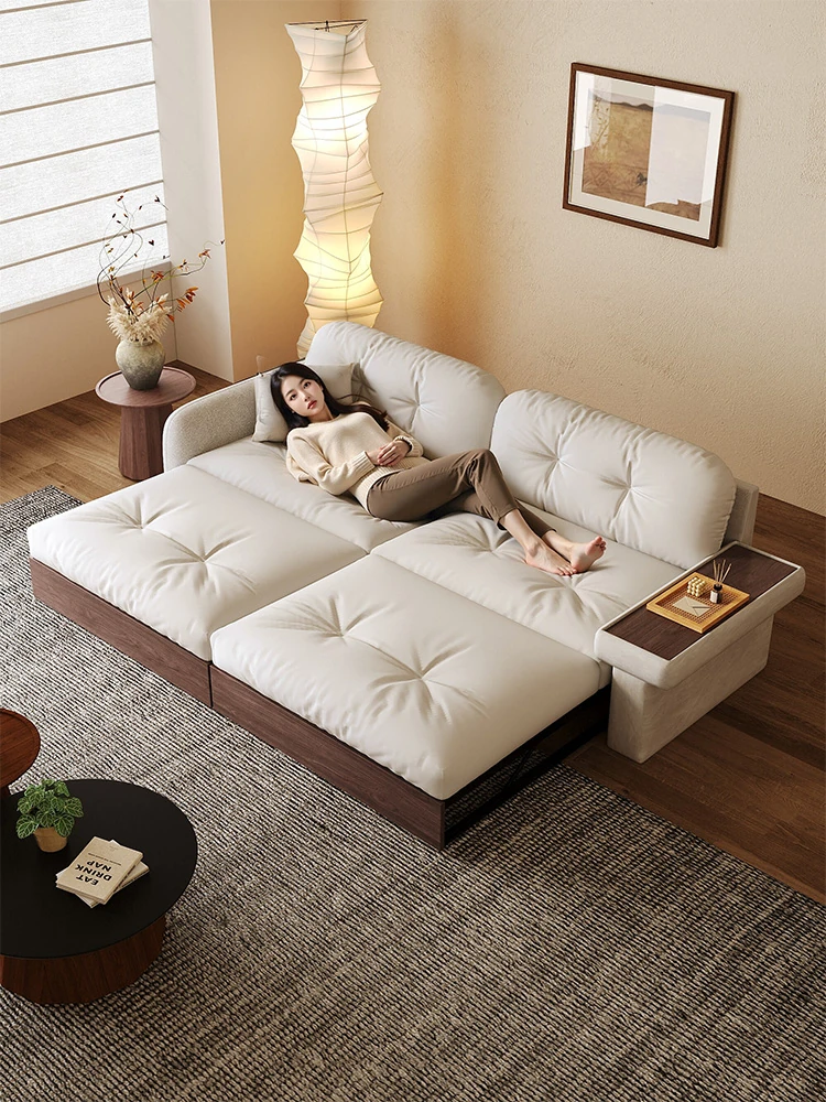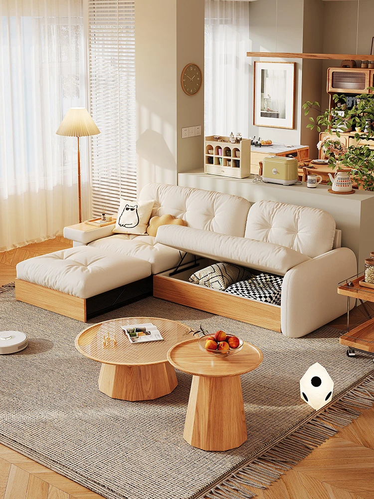 ワーナスの和風天然木製収納ソファ - 小さなリビングにぴったり!クリーミーなナチュラルウッドデザインで、雲のように柔らかい折りたたみソファベッド。収納スペースも充実しており、スタイリッシュで機能的な空間を演出します。
